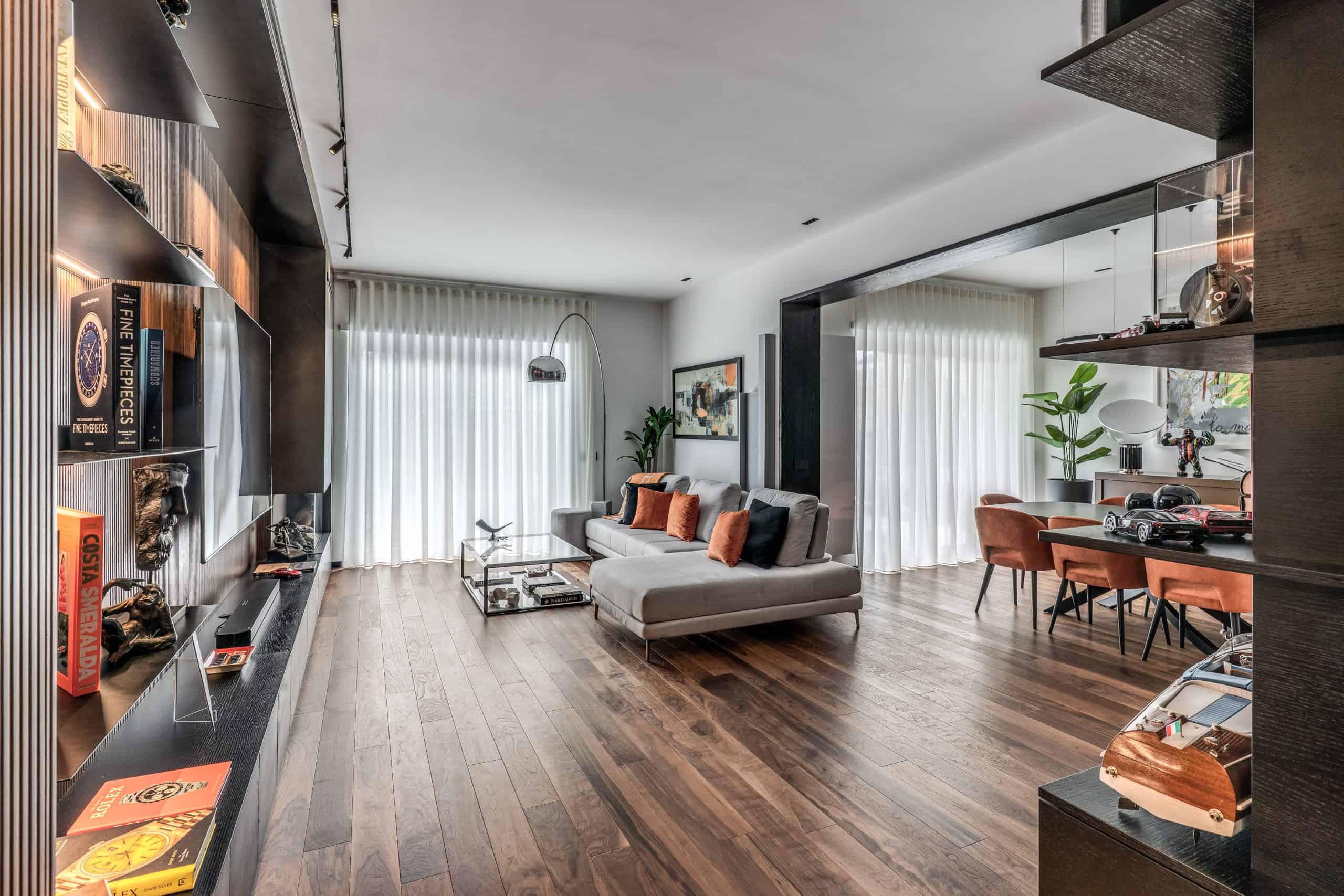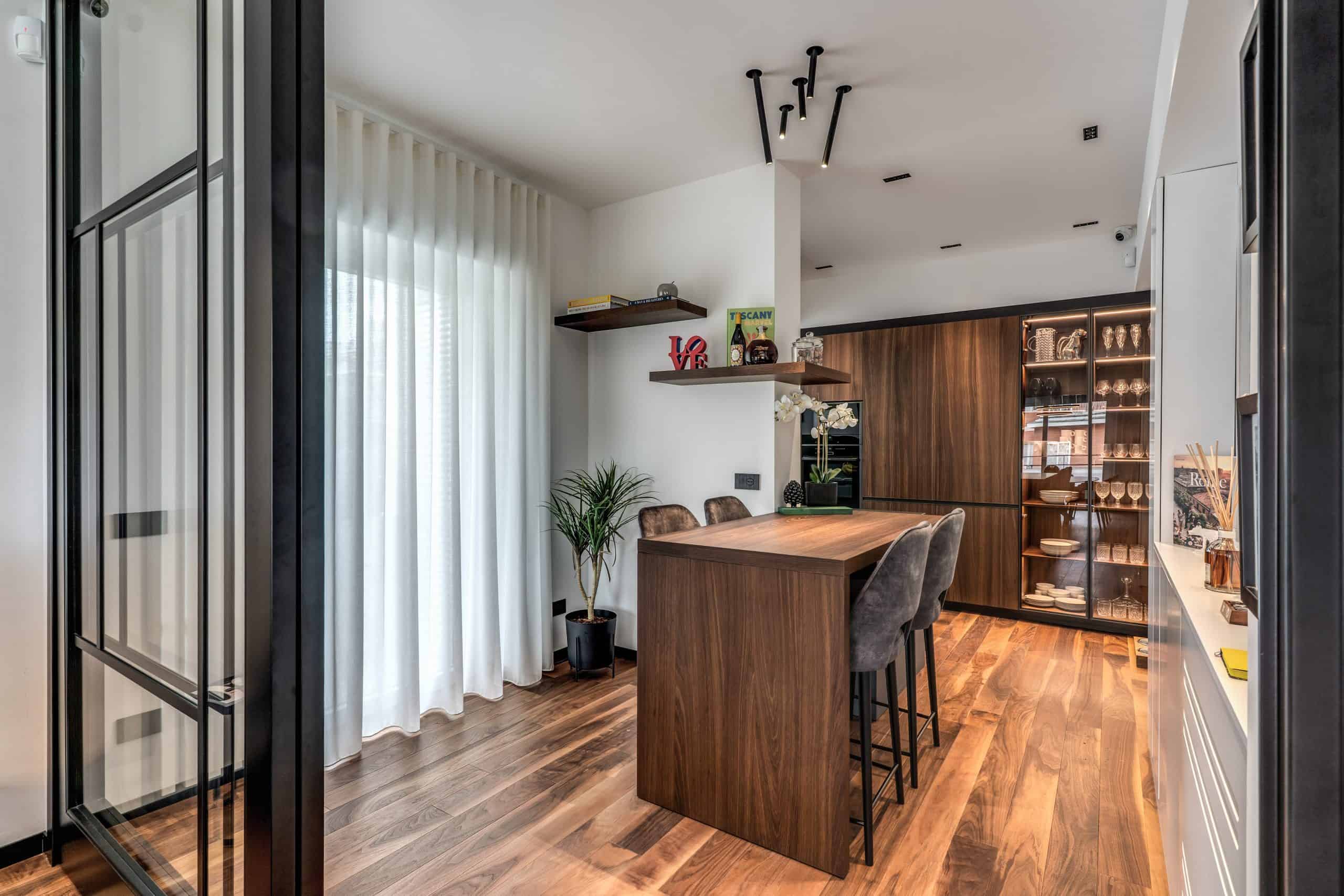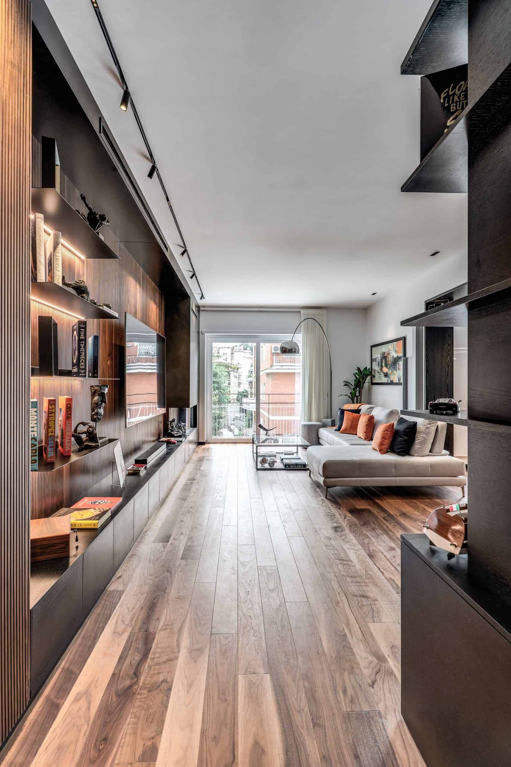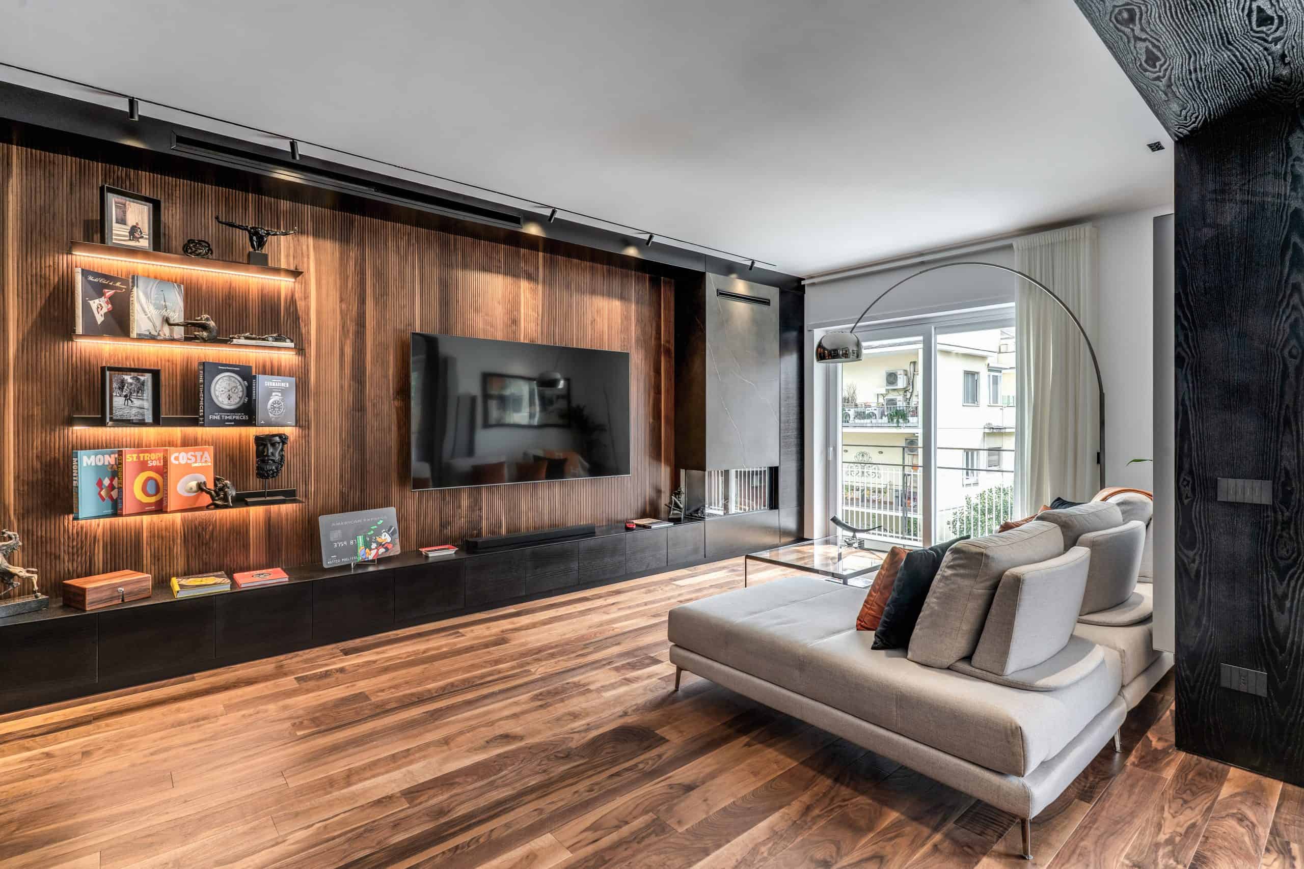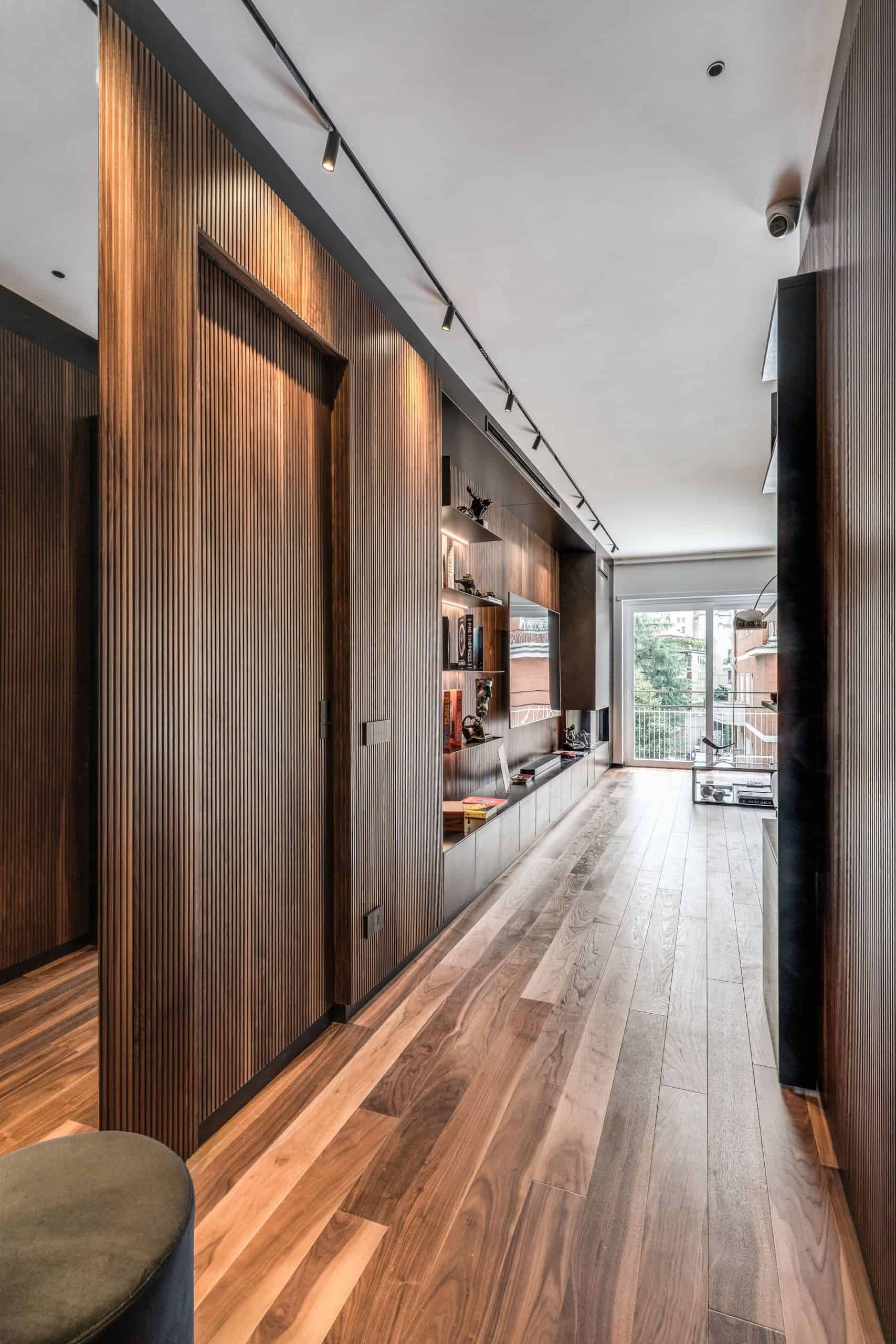 Sin dalla soglia, l’ingresso annuncia un linguaggio architettonico che fonde pulizia compositiva e intensità materica. Le superfici in noce americano disegnano un pavimento continuo, vivo, cangiante, che attraversa tutto l’appartamento come un tappeto prezioso. Le pareti irivestite in legno noce americano cannettato accolgono una lama di luce verticale che guida lo sguardo e accompagna il passo. È una scena silenziosa e teatrale, dove il dettaglio racconta già un’intera poetica. Il soggiorno si apre come un grande salone borghese, reinterpretato con sensibilità contemporanea. Il sistema libreria a tutta parete in legno scuro, con moduli aperti e retroilluminati, ospita oggetti d’arte, libri, modellini e ricordi, trasformando la parete attrezzata in un museo personale.Il divano centrale, ampio e scultoreo, si veste di tessuti neutri e accoglie accenti cromatici aranciati nei cuscini, in dialogo con le sedie della zona pranzo. La luce naturale, filtrata da tende a onda, invade la scena con delicatezza, ammorbidendo i contrasti materici e disegnando una spazialità profonda e ariosa.Racchiusa tra pannelli in vetro e legno, la cucina è un blocco elegante e rigoroso. I pensili in essenza e i frontali in grigio fumo si articolano intorno all’isola centrale in legno scuro, che funge da bar, tavolo conviviale e centro operativo. I volumi sono netti, privi di maniglie, disegnati come architetture autonome.Il gioco dei pieni e vuoti, insieme alla presenza della vetrina retroilluminata con oggetti in esposizione, restituisce una cucina non solo funzionale, ma anche espressiva, vissuta come spazio di rappresentazione e ritualità.Separata da una cornice architettonica in legno bruno, la zona pranzo accoglie un tavolo scuro in pietra naturale, coronato da due lampade ad anello sospese, che sembrano fluttuare nell’aria. Le sedute in velluto arancio bruciato portano calore e intimità, mentre sullo sfondo un’opera d’arte astratta incornicia lo spazio con un gesto pittorico e materico.La camera principale è un rifugio elegante e misurato. Il blu intenso della parete di testata, modulato da righe verticali e cornici sottili, fa da fondale al letto imbottito in tessuto chiaro. Le lampade a sospensione dai toni ottone satinato e i comodini in noce sospesi rafforzano la leggerezza compositiva.Il vero colpo di scena è celato dietro la parete TV: una cabina armadio luminosa e perfettamente organizzata si apre come una boutique privata. Ripiani retroilluminati e nicchie espositive trasformano il contenimento in una celebrazione del gusto personale. Il bagno en suite si presenta con superfici in grès effetto marmo e volumi puri. Il lavabo integrato nel top in pietra dialoga con la rubinetteria nera opaca, mentre la doccia walk-in è definita da una parete scura a vena continua che funge da quinta scenica. Un taglio di luce perimetrale esalta la verticalità dello spazio, trasformando la doccia in un rito architettonico. Il bagno degli ospiti, più raccolto, si distingue per equilibrio e coerenza materica. Le pareti in grès strutturato effetto tessuto accolgono un mobile lavabo con frontale listellato e lavabo integrato. Le luci radenti e il grande specchio retroilluminato restituiscono profondità e garbo, senza mai rinunciare alla funzionalità. La seconda camera ospita un doppio ruolo: zona relax con divano letto e area studio. Una scrivania sospesa in noce, affiancata da mensole, opere grafiche e fotografie d’epoca, racconta un luogo di concentrazione intima. I tessuti chiari e vellutati, i cuscini petrolio e la presenza di piante e oggetti evocano una dimensione privata, ma aperta, perfetta per accogliere o lavorare.