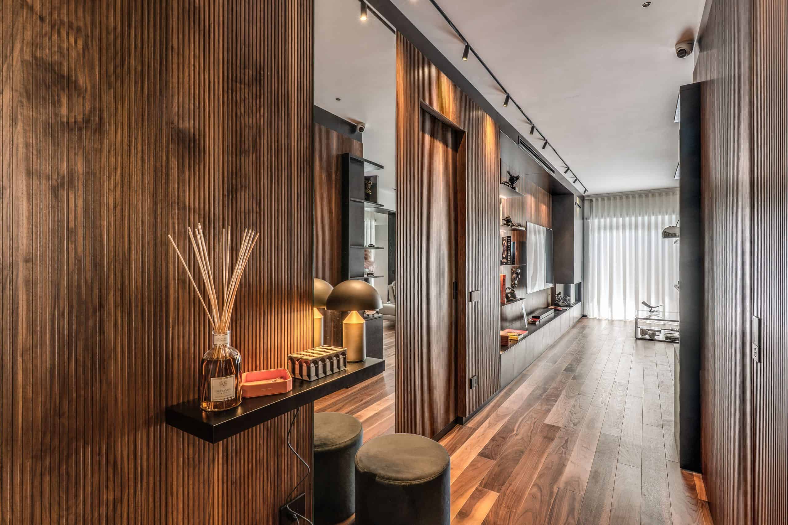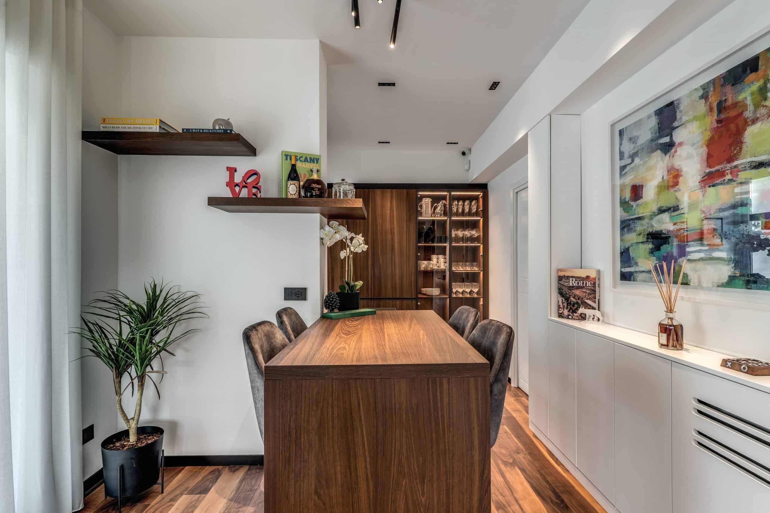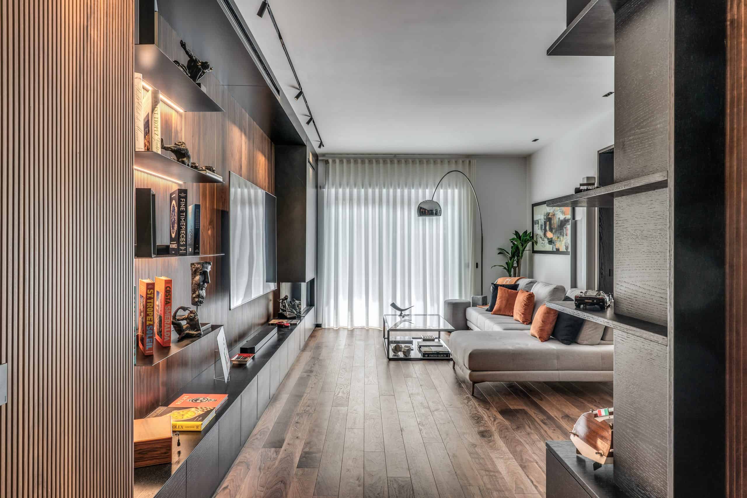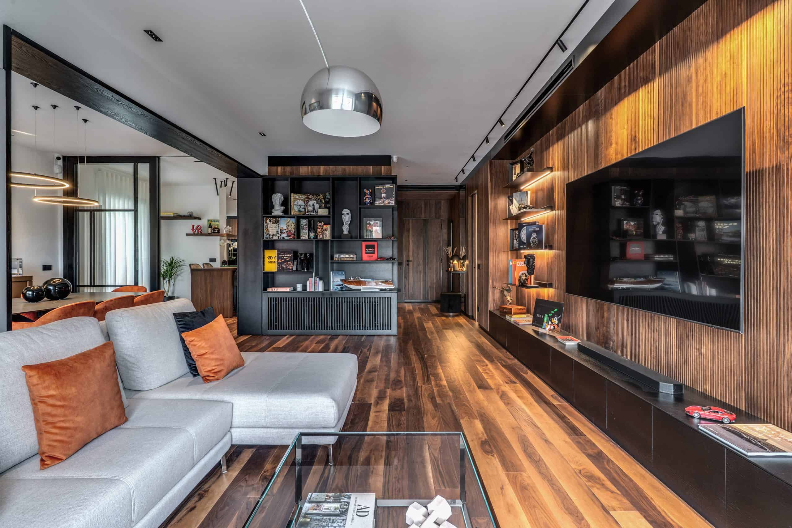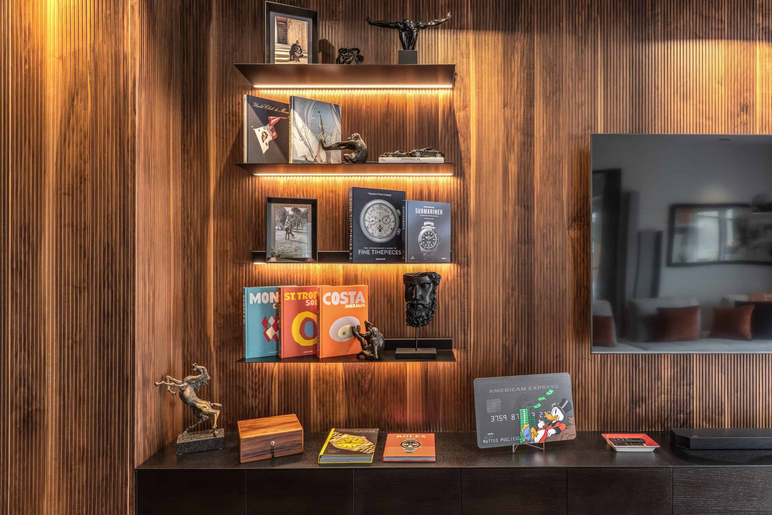 Sin dalla soglia, l’ingresso annuncia un linguaggio architettonico che fonde pulizia compositiva e intensità materica. Le superfici in noce americano disegnano un pavimento continuo, vivo, cangiante, che attraversa tutto l’appartamento come un tappeto prezioso. Le pareti irivestite in legno noce americano cannettato accolgono una lama di luce verticale che guida lo sguardo e accompagna il passo. È una scena silenziosa e teatrale, dove il dettaglio racconta già un’intera poetica. Il soggiorno si apre come un grande salone borghese, reinterpretato con sensibilità contemporanea. Il sistema libreria a tutta parete in legno scuro, con moduli aperti e retroilluminati, ospita oggetti d’arte, libri, modellini e ricordi, trasformando la parete attrezzata in un museo personale.Il divano centrale, ampio e scultoreo, si veste di tessuti neutri e accoglie accenti cromatici aranciati nei cuscini, in dialogo con le sedie della zona pranzo. La luce naturale, filtrata da tende a onda, invade la scena con delicatezza, ammorbidendo i contrasti materici e disegnando una spazialità profonda e ariosa.Racchiusa tra pannelli in vetro e legno, la cucina è un blocco elegante e rigoroso. I pensili in essenza e i frontali in grigio fumo si articolano intorno all’isola centrale in legno scuro, che funge da bar, tavolo conviviale e centro operativo. I volumi sono netti, privi di maniglie, disegnati come architetture autonome.Il gioco dei pieni e vuoti, insieme alla presenza della vetrina retroilluminata con oggetti in esposizione, restituisce una cucina non solo funzionale, ma anche espressiva, vissuta come spazio di rappresentazione e ritualità.Separata da una cornice architettonica in legno bruno, la zona pranzo accoglie un tavolo scuro in pietra naturale, coronato da due lampade ad anello sospese, che sembrano fluttuare nell’aria. Le sedute in velluto arancio bruciato portano calore e intimità, mentre sullo sfondo un’opera d’arte astratta incornicia lo spazio con un gesto pittorico e materico.La camera principale è un rifugio elegante e misurato. Il blu intenso della parete di testata, modulato da righe verticali e cornici sottili, fa da fondale al letto imbottito in tessuto chiaro. Le lampade a sospensione dai toni ottone satinato e i comodini in noce sospesi rafforzano la leggerezza compositiva.Il vero colpo di scena è celato dietro la parete TV: una cabina armadio luminosa e perfettamente organizzata si apre come una boutique privata. Ripiani retroilluminati e nicchie espositive trasformano il contenimento in una celebrazione del gusto personale. Il bagno en suite si presenta con superfici in grès effetto marmo e volumi puri. Il lavabo integrato nel top in pietra dialoga con la rubinetteria nera opaca, mentre la doccia walk-in è definita da una parete scura a vena continua che funge da quinta scenica. Un taglio di luce perimetrale esalta la verticalità dello spazio, trasformando la doccia in un rito architettonico. Il bagno degli ospiti, più raccolto, si distingue per equilibrio e coerenza materica. Le pareti in grès strutturato effetto tessuto accolgono un mobile lavabo con frontale listellato e lavabo integrato. Le luci radenti e il grande specchio retroilluminato restituiscono profondità e garbo, senza mai rinunciare alla funzionalità. La seconda camera ospita un doppio ruolo: zona relax con divano letto e area studio. Una scrivania sospesa in noce, affiancata da mensole, opere grafiche e fotografie d’epoca, racconta un luogo di concentrazione intima. I tessuti chiari e vellutati, i cuscini petrolio e la presenza di piante e oggetti evocano una dimensione privata, ma aperta, perfetta per accogliere o lavorare.