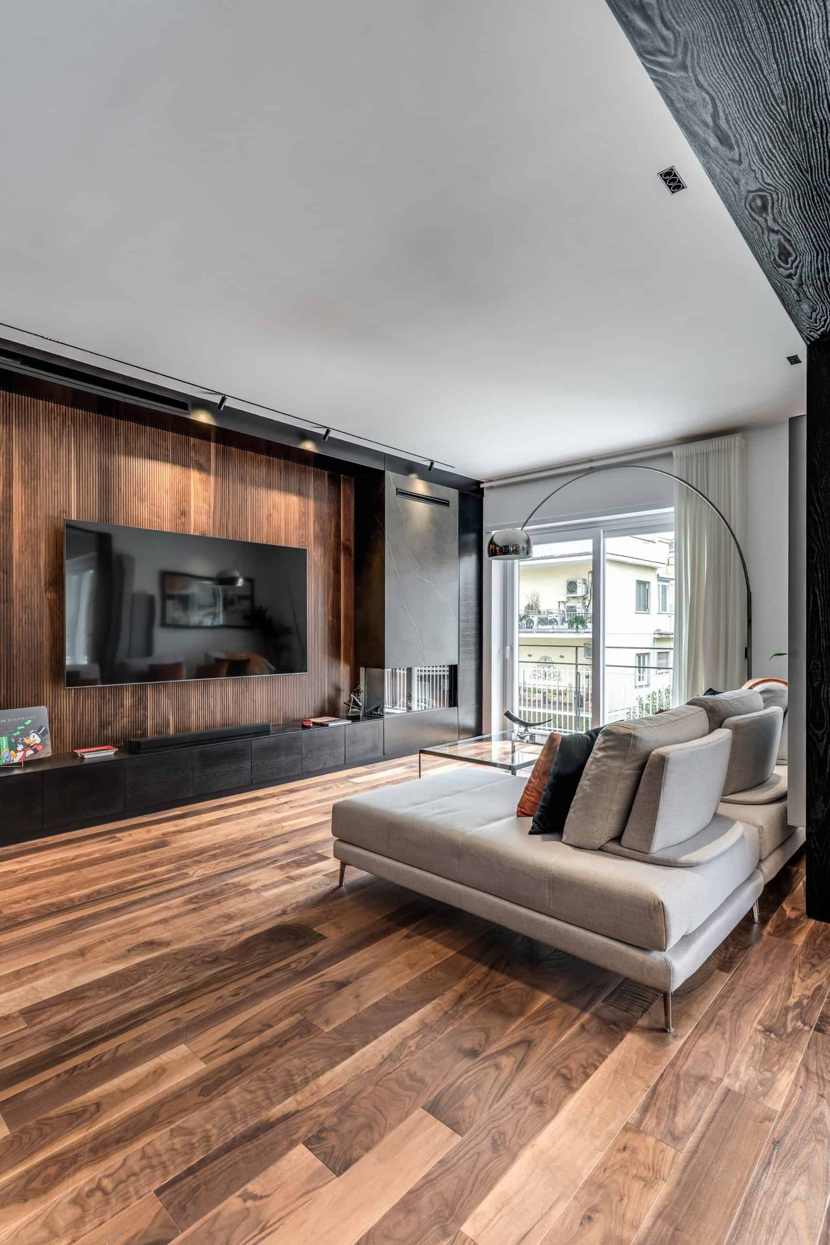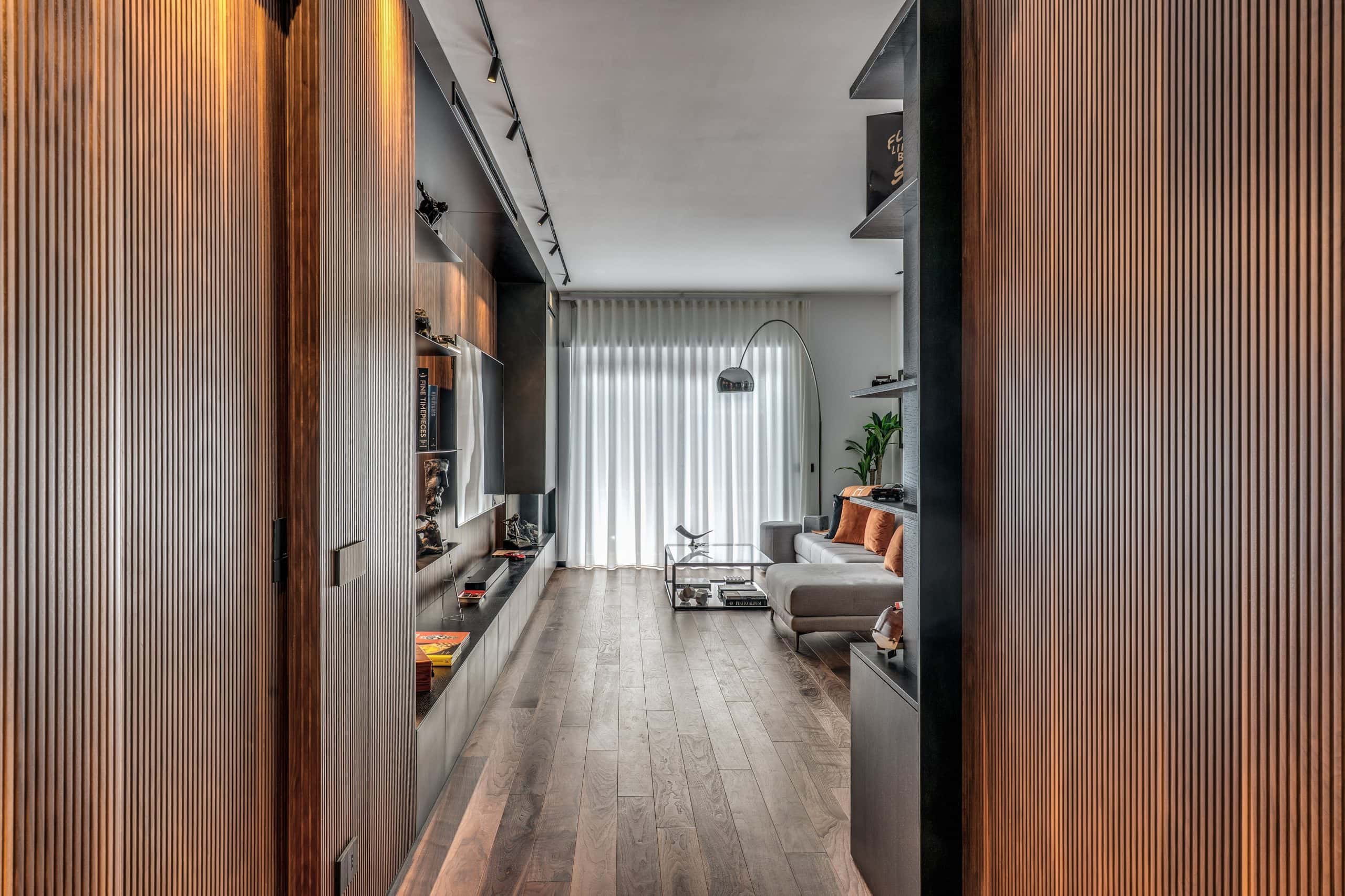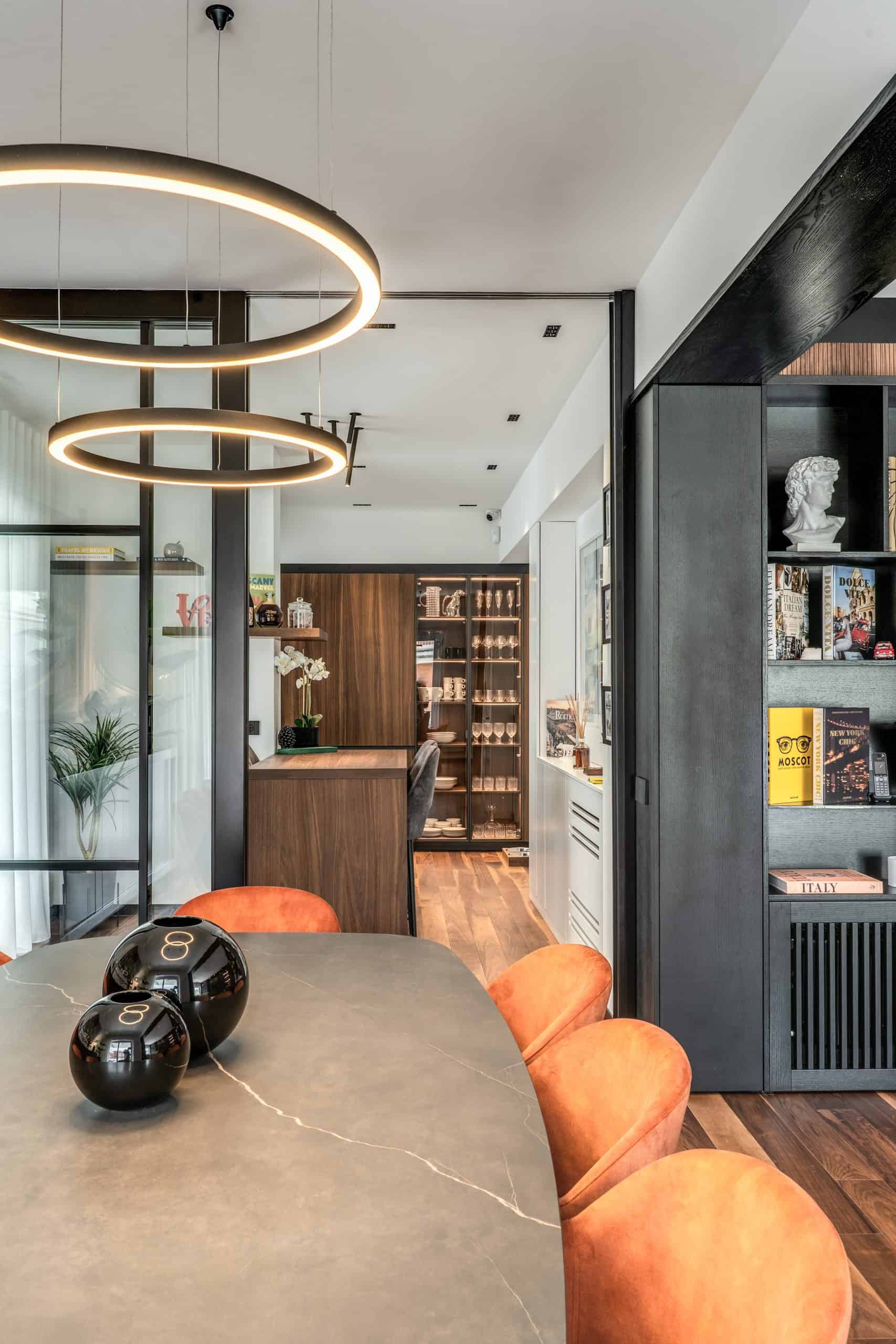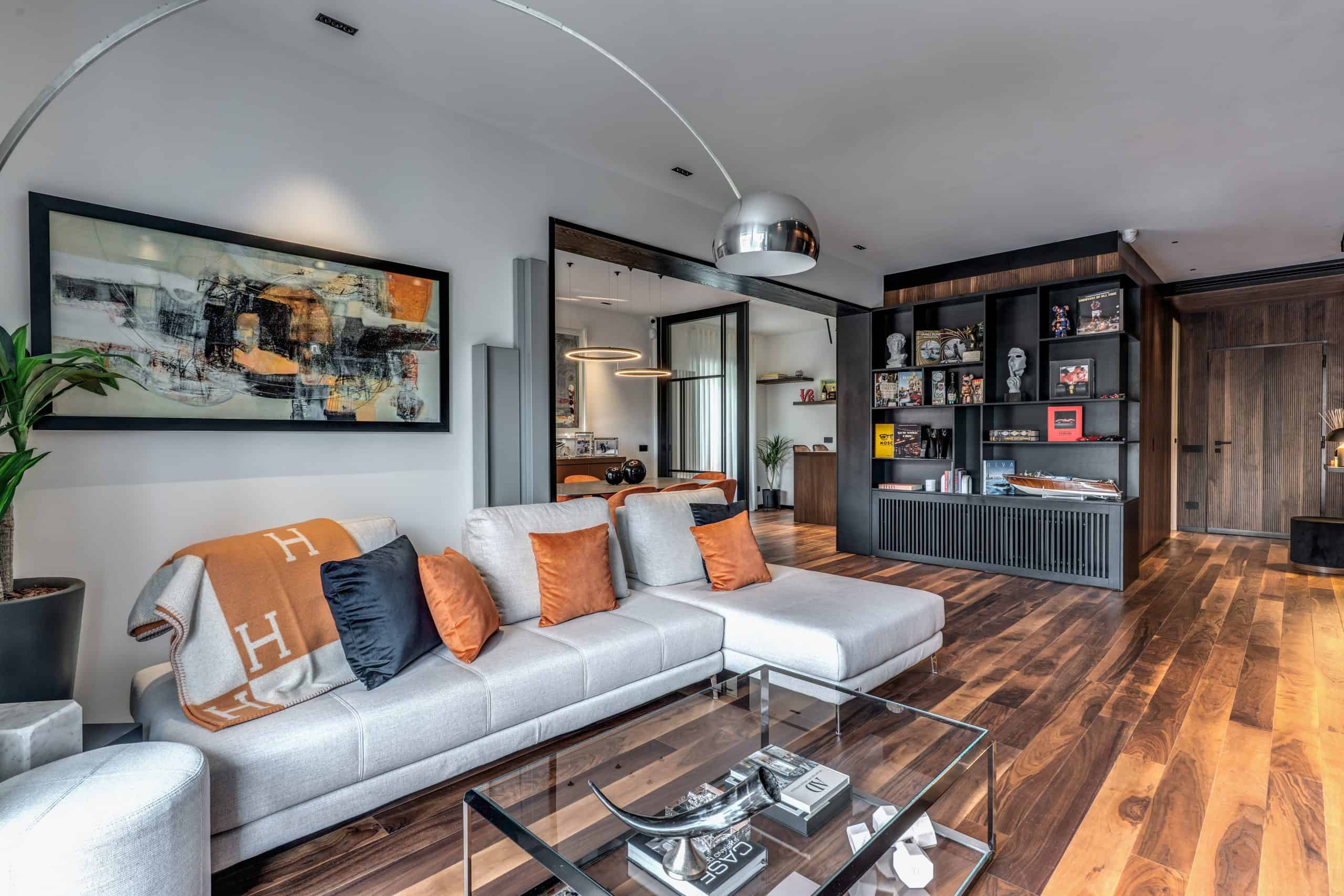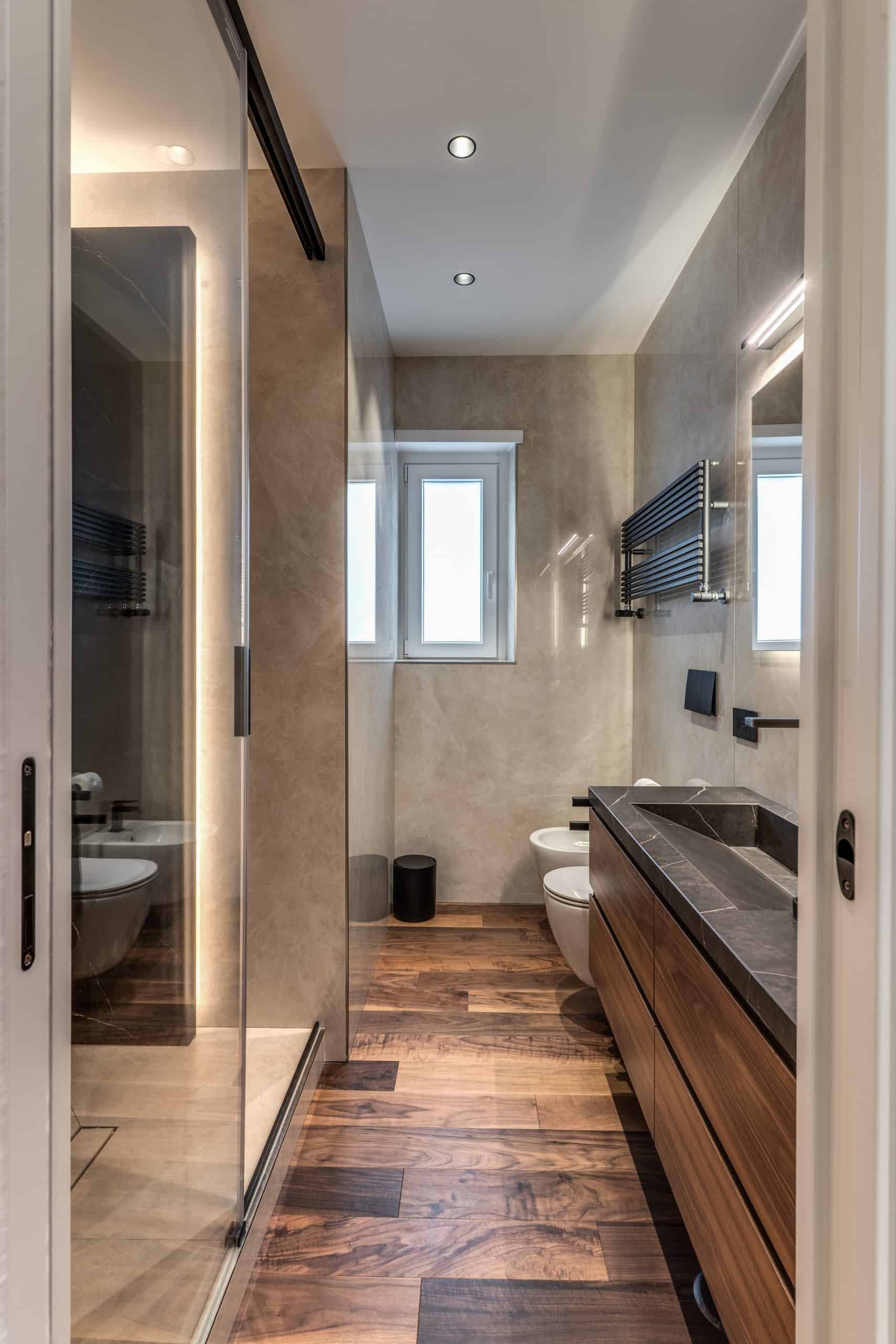 Sin dalla soglia, l’ingresso annuncia un linguaggio architettonico che fonde pulizia compositiva e intensità materica. Le superfici in noce americano disegnano un pavimento continuo, vivo, cangiante, che attraversa tutto l’appartamento come un tappeto prezioso. Le pareti irivestite in legno noce americano cannettato accolgono una lama di luce verticale che guida lo sguardo e accompagna il passo. È una scena silenziosa e teatrale, dove il dettaglio racconta già un’intera poetica. Il soggiorno si apre come un grande salone borghese, reinterpretato con sensibilità contemporanea. Il sistema libreria a tutta parete in legno scuro, con moduli aperti e retroilluminati, ospita oggetti d’arte, libri, modellini e ricordi, trasformando la parete attrezzata in un museo personale.Il divano centrale, ampio e scultoreo, si veste di tessuti neutri e accoglie accenti cromatici aranciati nei cuscini, in dialogo con le sedie della zona pranzo. La luce naturale, filtrata da tende a onda, invade la scena con delicatezza, ammorbidendo i contrasti materici e disegnando una spazialità profonda e ariosa.Racchiusa tra pannelli in vetro e legno, la cucina è un blocco elegante e rigoroso. I pensili in essenza e i frontali in grigio fumo si articolano intorno all’isola centrale in legno scuro, che funge da bar, tavolo conviviale e centro operativo. I volumi sono netti, privi di maniglie, disegnati come architetture autonome.Il gioco dei pieni e vuoti, insieme alla presenza della vetrina retroilluminata con oggetti in esposizione, restituisce una cucina non solo funzionale, ma anche espressiva, vissuta come spazio di rappresentazione e ritualità.Separata da una cornice architettonica in legno bruno, la zona pranzo accoglie un tavolo scuro in pietra naturale, coronato da due lampade ad anello sospese, che sembrano fluttuare nell’aria. Le sedute in velluto arancio bruciato portano calore e intimità, mentre sullo sfondo un’opera d’arte astratta incornicia lo spazio con un gesto pittorico e materico.La camera principale è un rifugio elegante e misurato. Il blu intenso della parete di testata, modulato da righe verticali e cornici sottili, fa da fondale al letto imbottito in tessuto chiaro. Le lampade a sospensione dai toni ottone satinato e i comodini in noce sospesi rafforzano la leggerezza compositiva.Il vero colpo di scena è celato dietro la parete TV: una cabina armadio luminosa e perfettamente organizzata si apre come una boutique privata. Ripiani retroilluminati e nicchie espositive trasformano il contenimento in una celebrazione del gusto personale. Il bagno en suite si presenta con superfici in grès effetto marmo e volumi puri. Il lavabo integrato nel top in pietra dialoga con la rubinetteria nera opaca, mentre la doccia walk-in è definita da una parete scura a vena continua che funge da quinta scenica. Un taglio di luce perimetrale esalta la verticalità dello spazio, trasformando la doccia in un rito architettonico. Il bagno degli ospiti, più raccolto, si distingue per equilibrio e coerenza materica. Le pareti in grès strutturato effetto tessuto accolgono un mobile lavabo con frontale listellato e lavabo integrato. Le luci radenti e il grande specchio retroilluminato restituiscono profondità e garbo, senza mai rinunciare alla funzionalità. La seconda camera ospita un doppio ruolo: zona relax con divano letto e area studio. Una scrivania sospesa in noce, affiancata da mensole, opere grafiche e fotografie d’epoca, racconta un luogo di concentrazione intima. I tessuti chiari e vellutati, i cuscini petrolio e la presenza di piante e oggetti evocano una dimensione privata, ma aperta, perfetta per accogliere o lavorare.