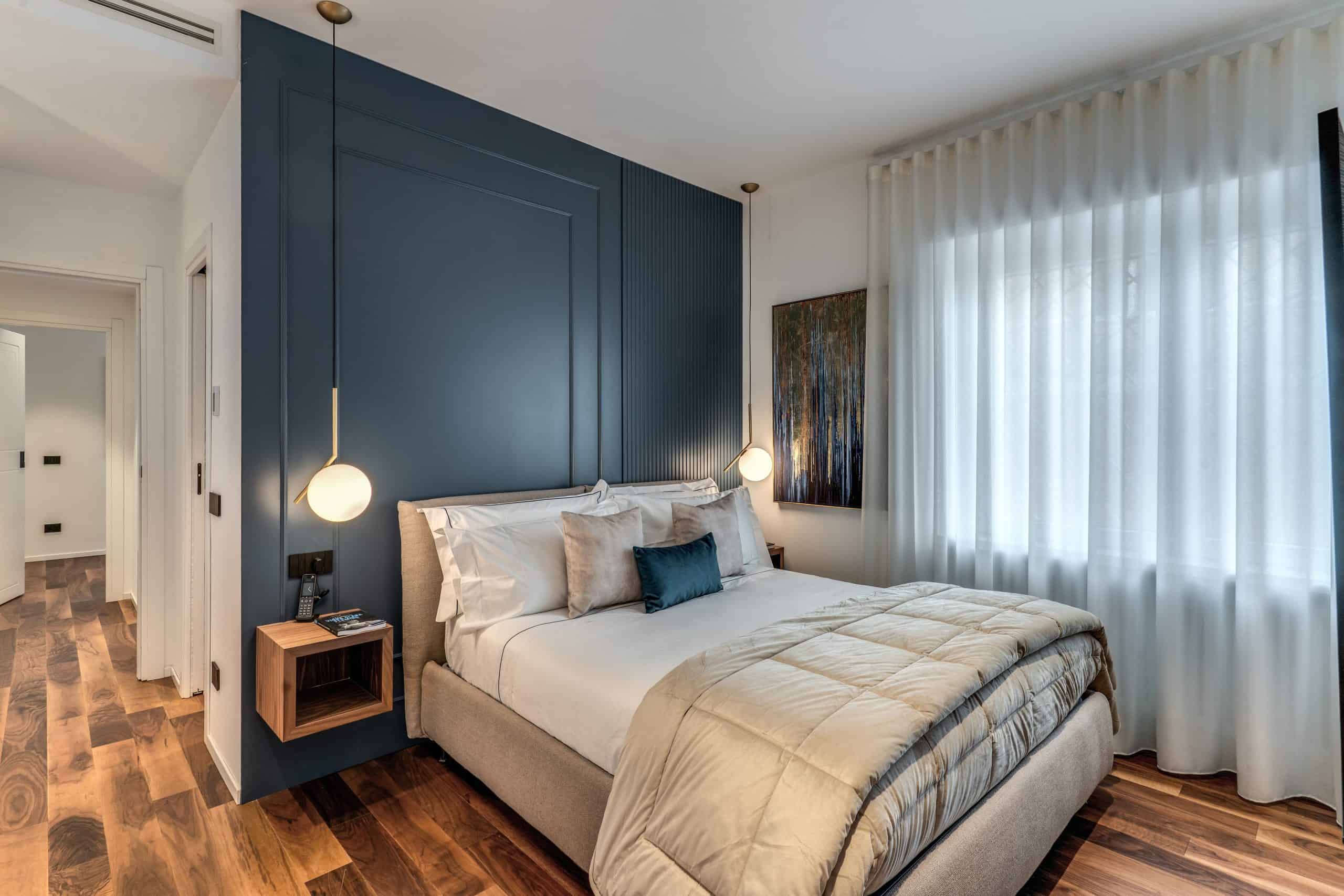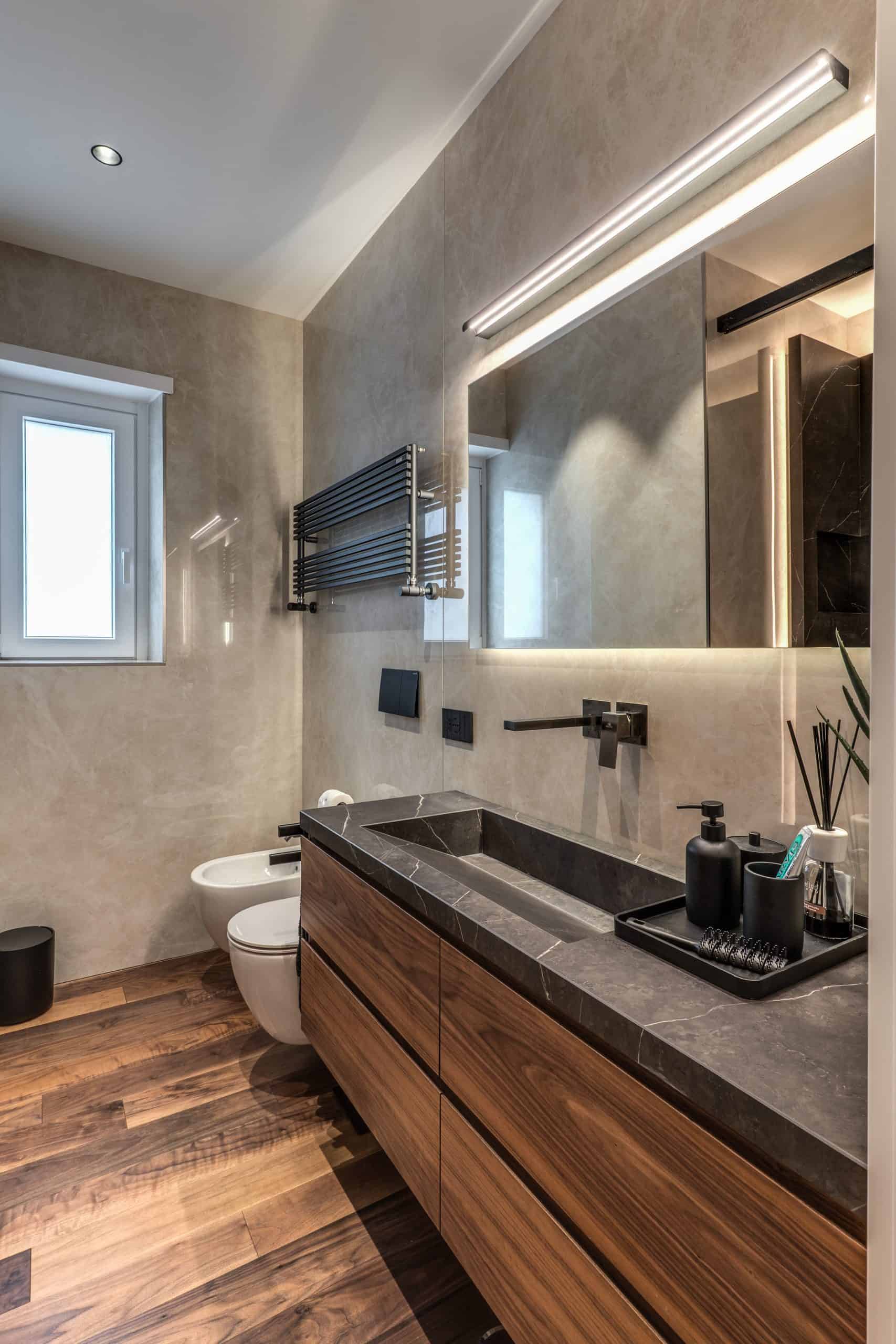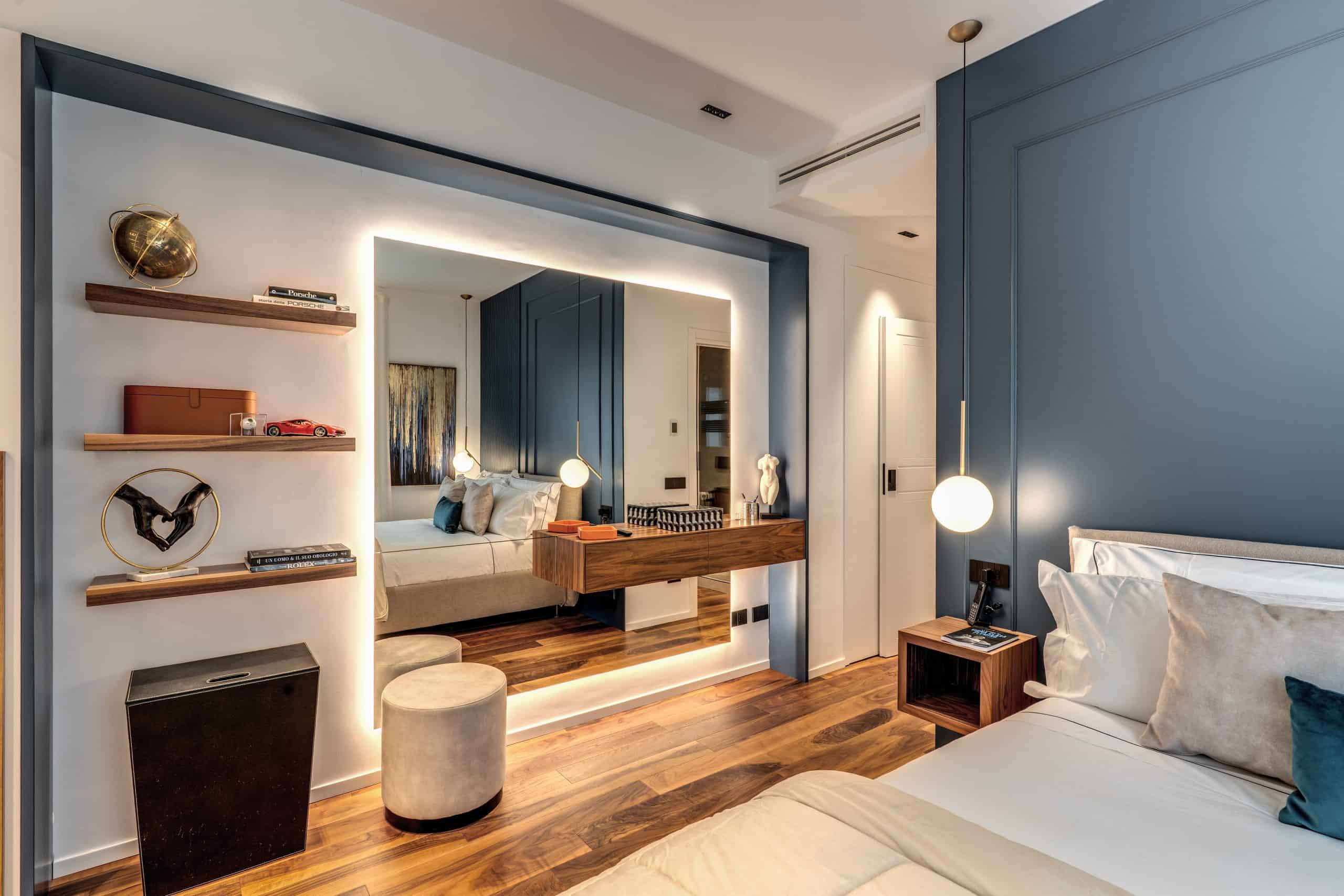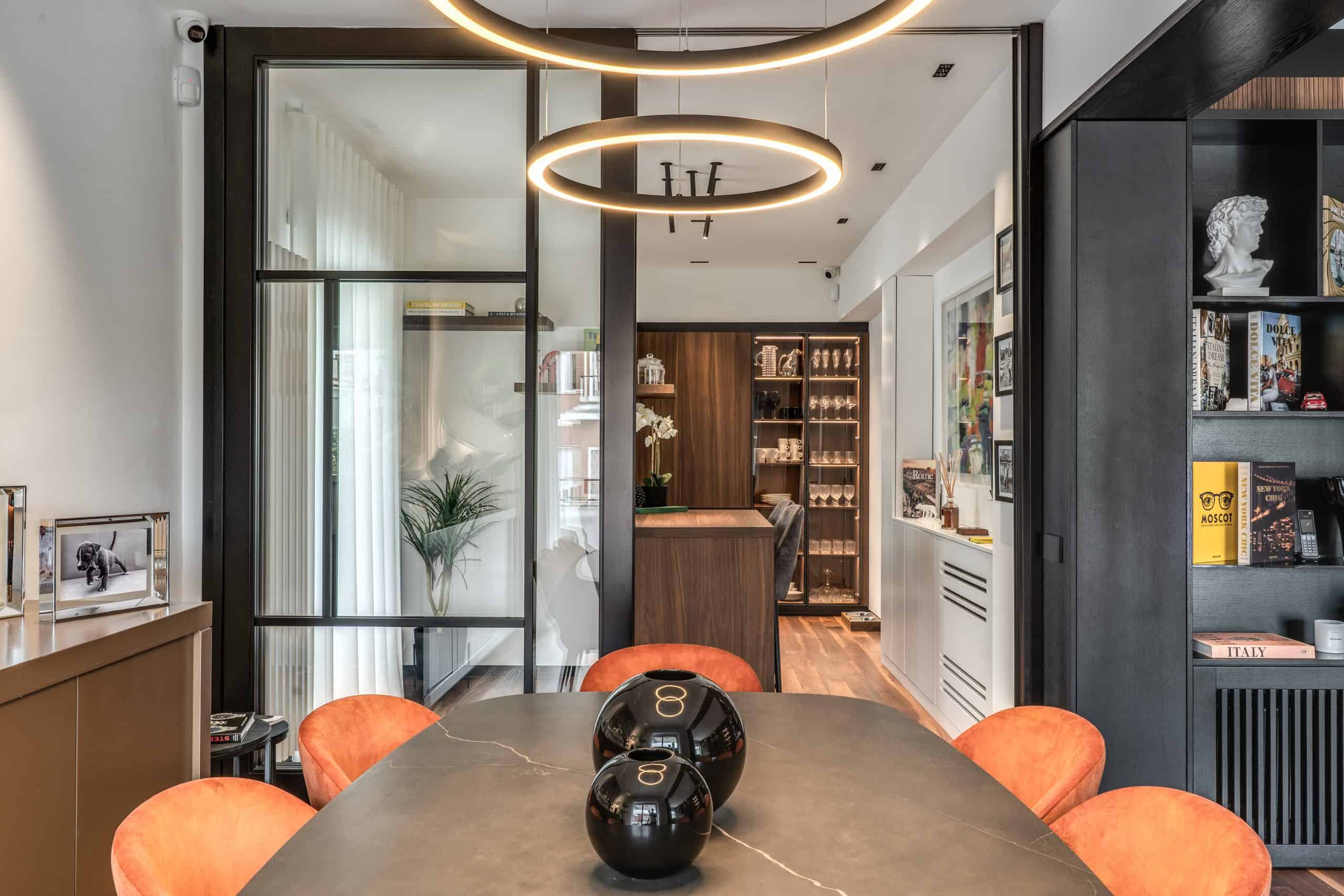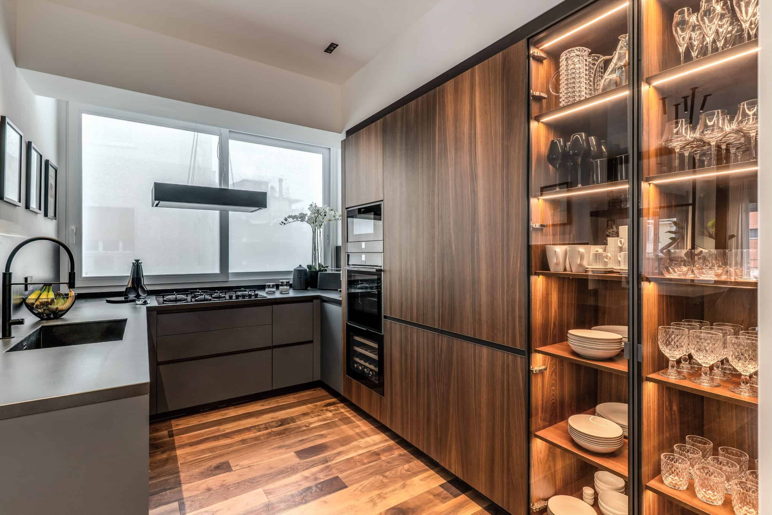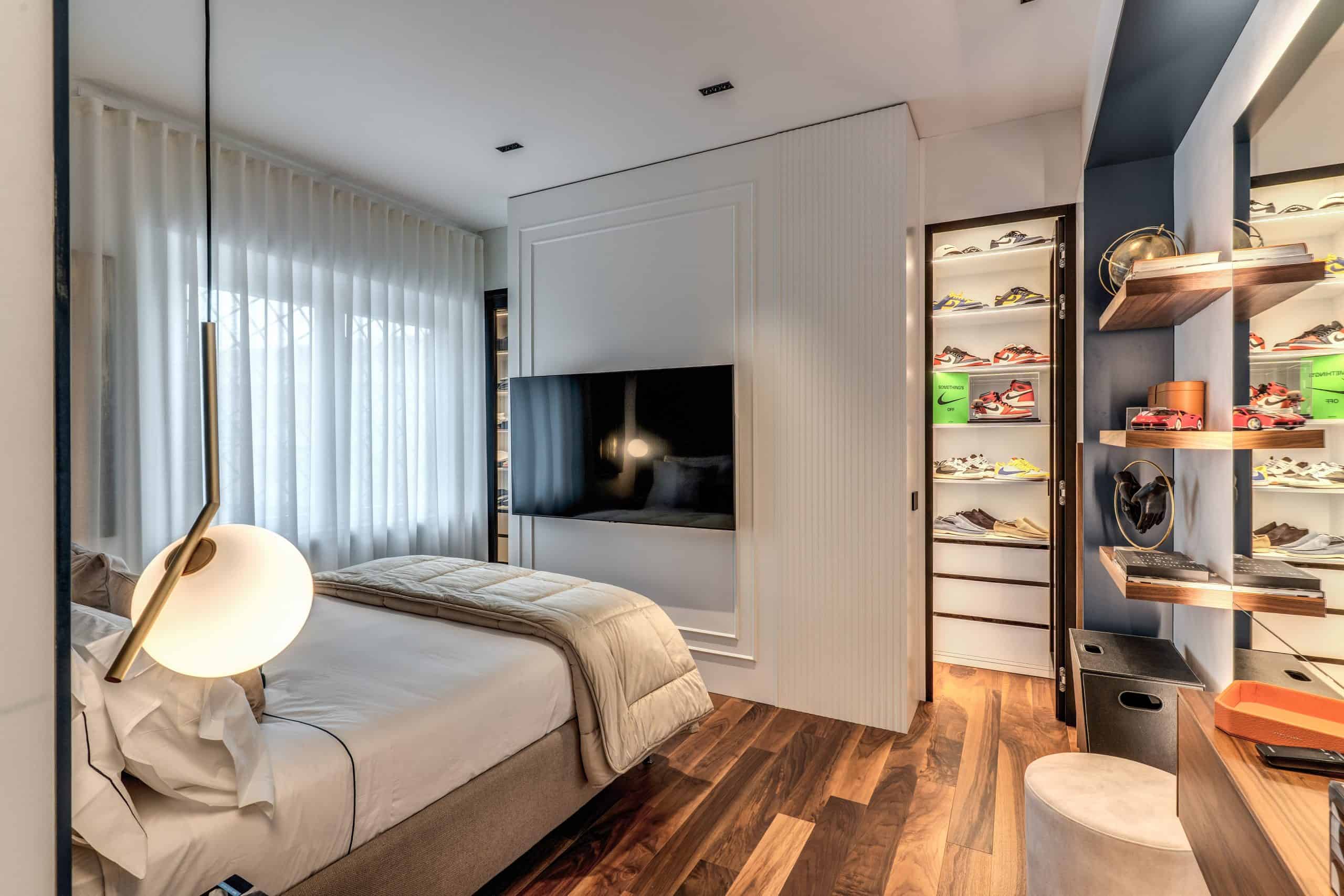 Sin dalla soglia, l’ingresso annuncia un linguaggio architettonico che fonde pulizia compositiva e intensità materica. Le superfici in noce americano disegnano un pavimento continuo, vivo, cangiante, che attraversa tutto l’appartamento come un tappeto prezioso. Le pareti irivestite in legno noce americano cannettato accolgono una lama di luce verticale che guida lo sguardo e accompagna il passo. È una scena silenziosa e teatrale, dove il dettaglio racconta già un’intera poetica. Il soggiorno si apre come un grande salone borghese, reinterpretato con sensibilità contemporanea. Il sistema libreria a tutta parete in legno scuro, con moduli aperti e retroilluminati, ospita oggetti d’arte, libri, modellini e ricordi, trasformando la parete attrezzata in un museo personale.Il divano centrale, ampio e scultoreo, si veste di tessuti neutri e accoglie accenti cromatici aranciati nei cuscini, in dialogo con le sedie della zona pranzo. La luce naturale, filtrata da tende a onda, invade la scena con delicatezza, ammorbidendo i contrasti materici e disegnando una spazialità profonda e ariosa.Racchiusa tra pannelli in vetro e legno, la cucina è un blocco elegante e rigoroso. I pensili in essenza e i frontali in grigio fumo si articolano intorno all’isola centrale in legno scuro, che funge da bar, tavolo conviviale e centro operativo. I volumi sono netti, privi di maniglie, disegnati come architetture autonome.Il gioco dei pieni e vuoti, insieme alla presenza della vetrina retroilluminata con oggetti in esposizione, restituisce una cucina non solo funzionale, ma anche espressiva, vissuta come spazio di rappresentazione e ritualità.Separata da una cornice architettonica in legno bruno, la zona pranzo accoglie un tavolo scuro in pietra naturale, coronato da due lampade ad anello sospese, che sembrano fluttuare nell’aria. Le sedute in velluto arancio bruciato portano calore e intimità, mentre sullo sfondo un’opera d’arte astratta incornicia lo spazio con un gesto pittorico e materico.La camera principale è un rifugio elegante e misurato. Il blu intenso della parete di testata, modulato da righe verticali e cornici sottili, fa da fondale al letto imbottito in tessuto chiaro. Le lampade a sospensione dai toni ottone satinato e i comodini in noce sospesi rafforzano la leggerezza compositiva.Il vero colpo di scena è celato dietro la parete TV: una cabina armadio luminosa e perfettamente organizzata si apre come una boutique privata. Ripiani retroilluminati e nicchie espositive trasformano il contenimento in una celebrazione del gusto personale. Il bagno en suite si presenta con superfici in grès effetto marmo e volumi puri. Il lavabo integrato nel top in pietra dialoga con la rubinetteria nera opaca, mentre la doccia walk-in è definita da una parete scura a vena continua che funge da quinta scenica. Un taglio di luce perimetrale esalta la verticalità dello spazio, trasformando la doccia in un rito architettonico. Il bagno degli ospiti, più raccolto, si distingue per equilibrio e coerenza materica. Le pareti in grès strutturato effetto tessuto accolgono un mobile lavabo con frontale listellato e lavabo integrato. Le luci radenti e il grande specchio retroilluminato restituiscono profondità e garbo, senza mai rinunciare alla funzionalità. La seconda camera ospita un doppio ruolo: zona relax con divano letto e area studio. Una scrivania sospesa in noce, affiancata da mensole, opere grafiche e fotografie d’epoca, racconta un luogo di concentrazione intima. I tessuti chiari e vellutati, i cuscini petrolio e la presenza di piante e oggetti evocano una dimensione privata, ma aperta, perfetta per accogliere o lavorare.