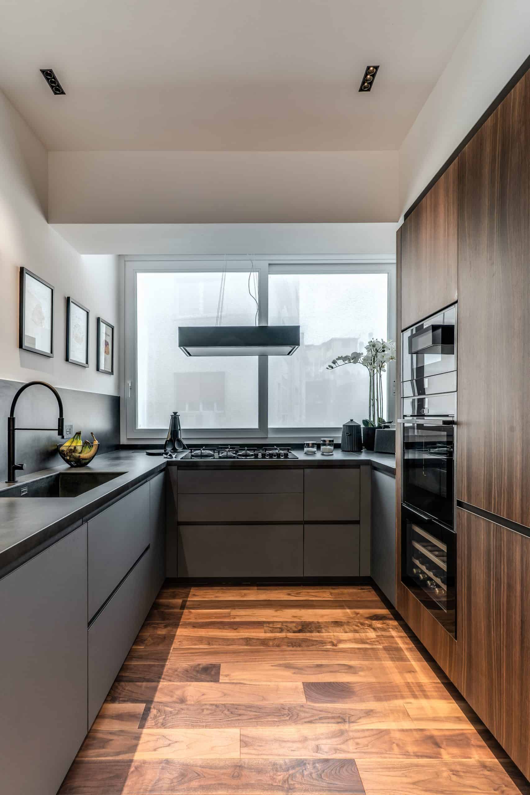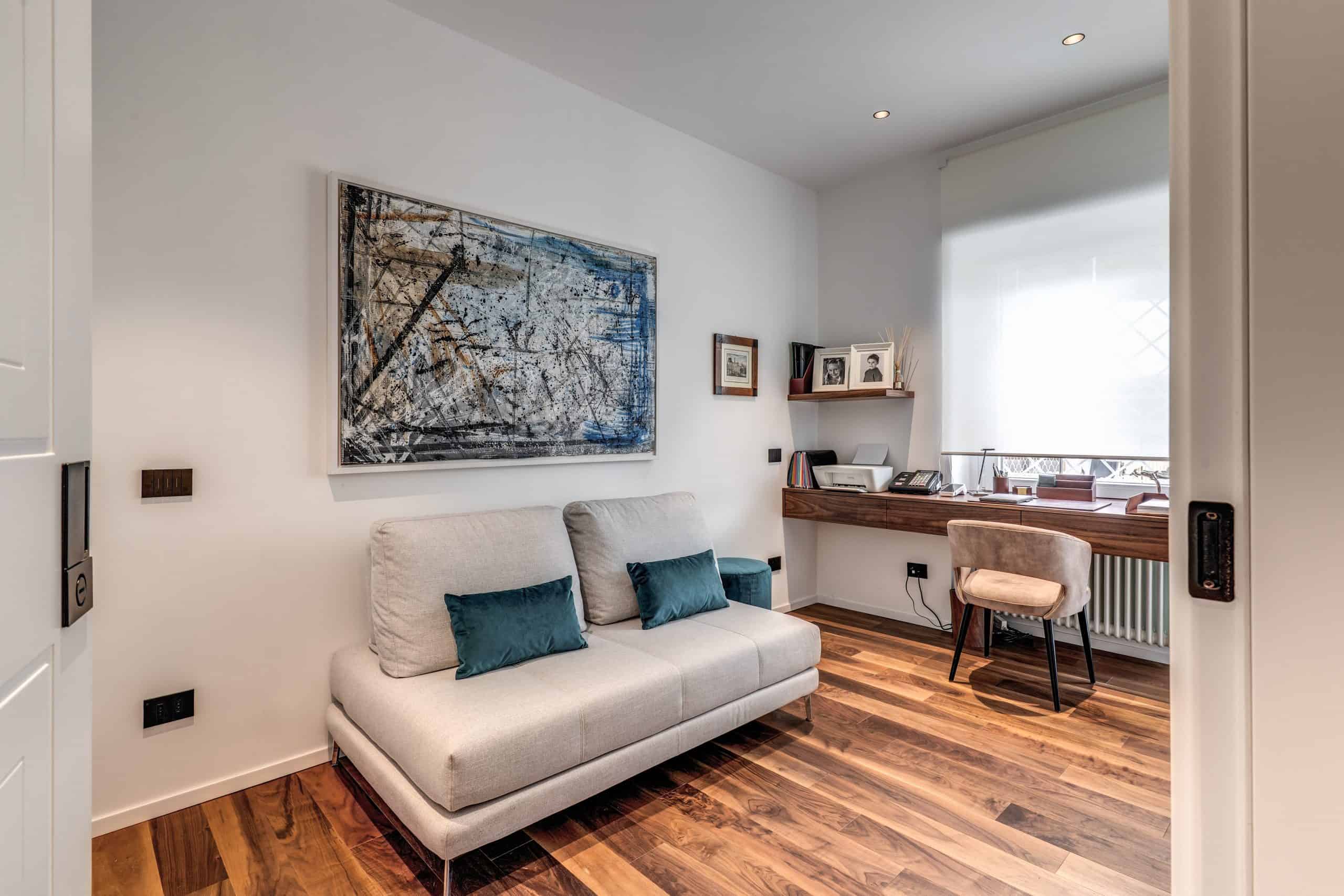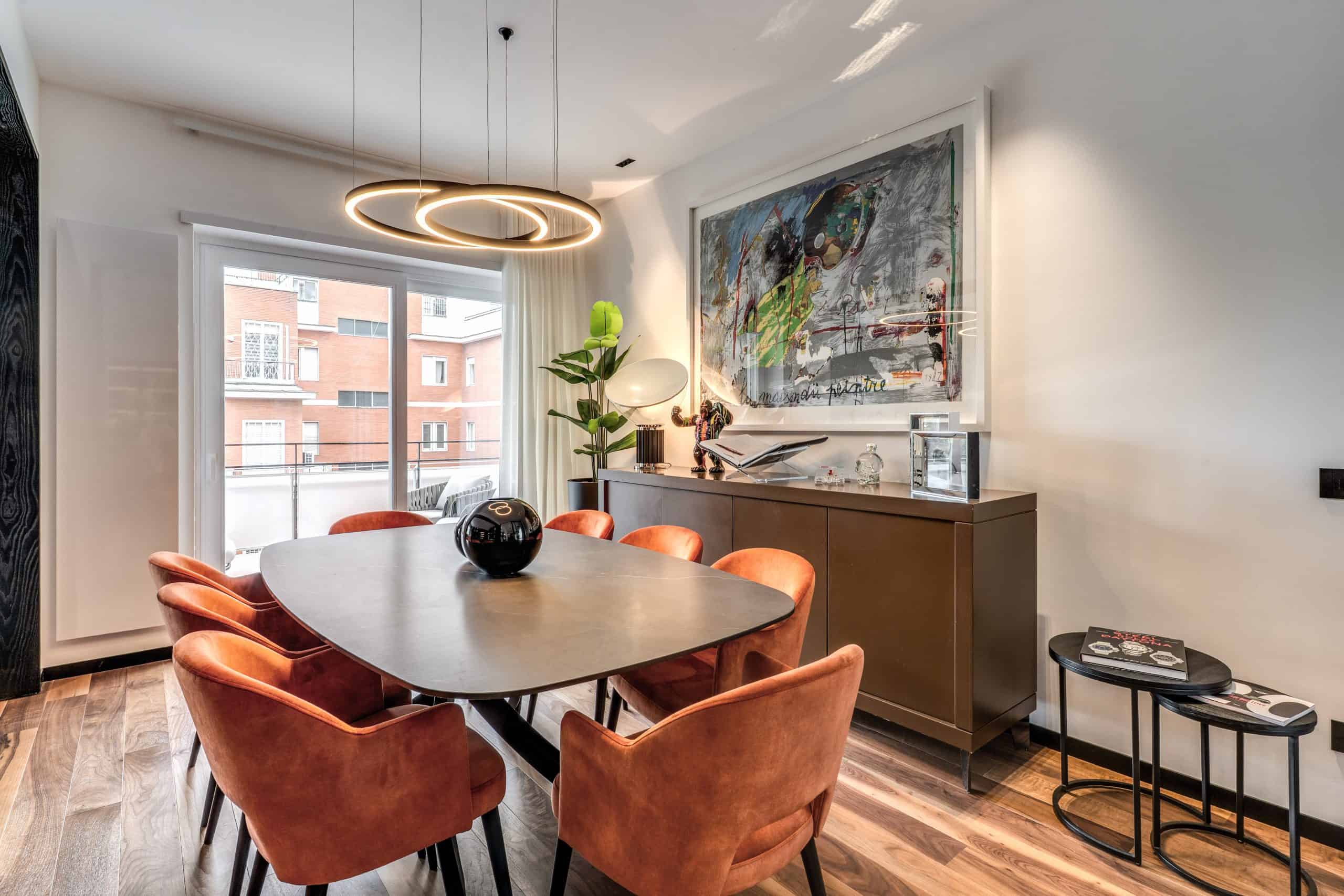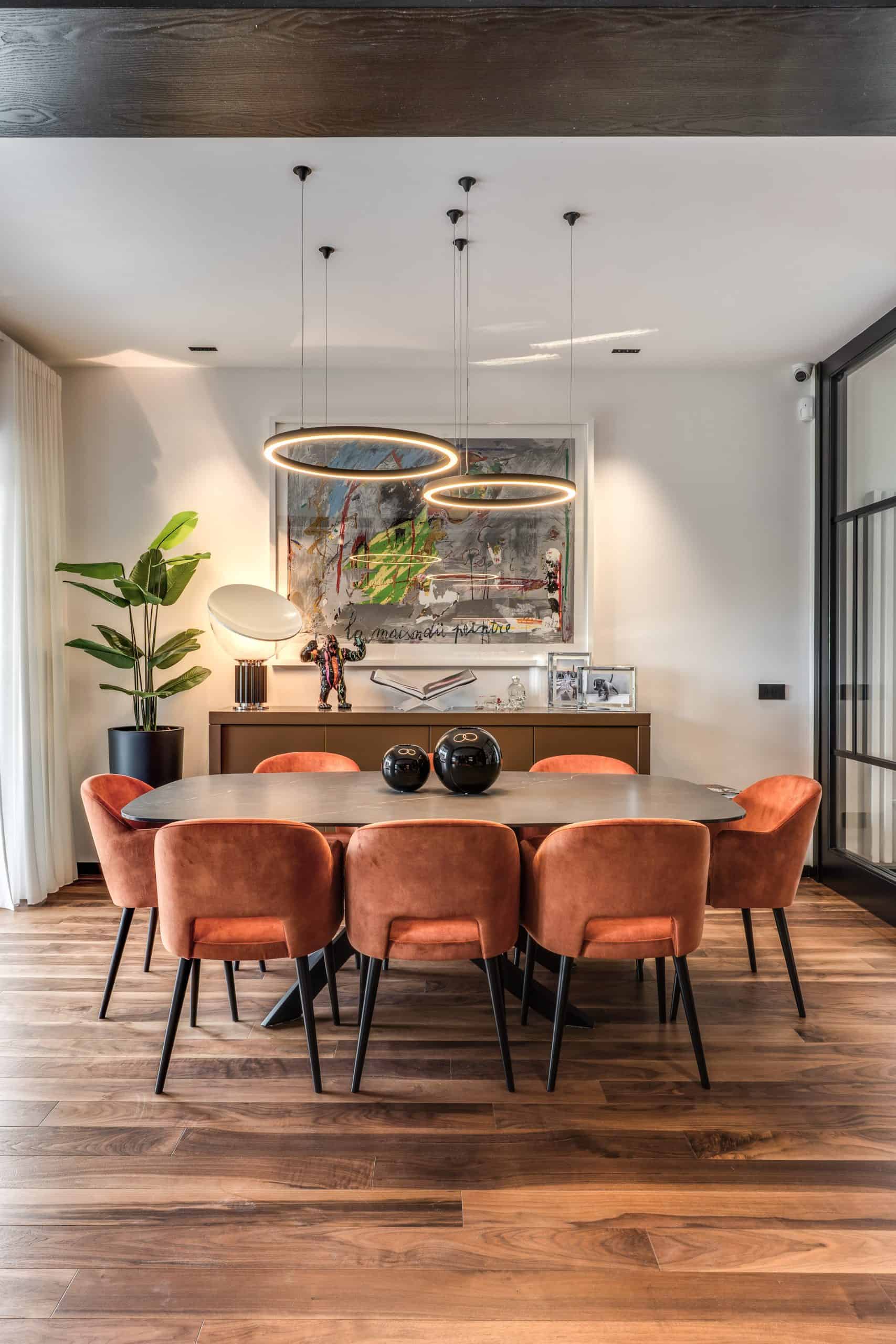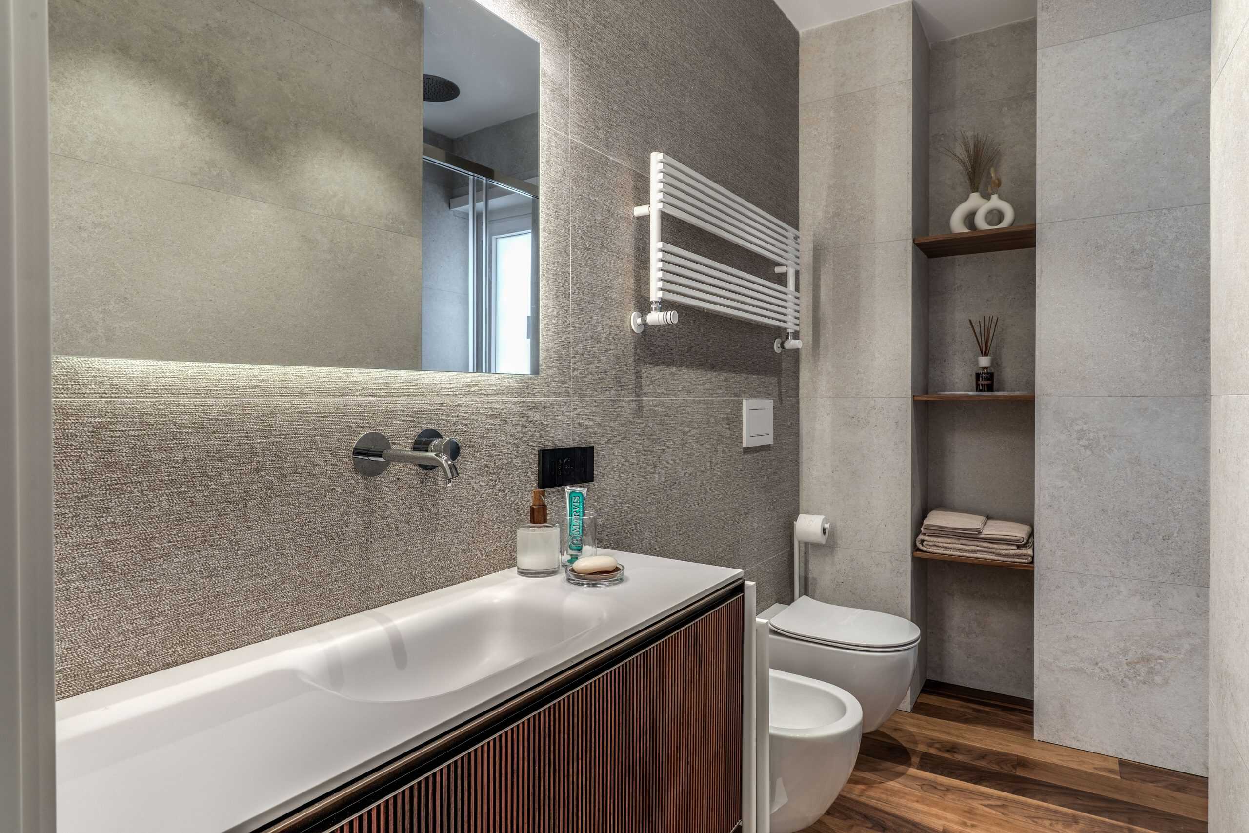 Sin dalla soglia, l’ingresso annuncia un linguaggio architettonico che fonde pulizia compositiva e intensità materica. Le superfici in noce americano disegnano un pavimento continuo, vivo, cangiante, che attraversa tutto l’appartamento come un tappeto prezioso. Le pareti irivestite in legno noce americano cannettato accolgono una lama di luce verticale che guida lo sguardo e accompagna il passo. È una scena silenziosa e teatrale, dove il dettaglio racconta già un’intera poetica. Il soggiorno si apre come un grande salone borghese, reinterpretato con sensibilità contemporanea. Il sistema libreria a tutta parete in legno scuro, con moduli aperti e retroilluminati, ospita oggetti d’arte, libri, modellini e ricordi, trasformando la parete attrezzata in un museo personale.Il divano centrale, ampio e scultoreo, si veste di tessuti neutri e accoglie accenti cromatici aranciati nei cuscini, in dialogo con le sedie della zona pranzo. La luce naturale, filtrata da tende a onda, invade la scena con delicatezza, ammorbidendo i contrasti materici e disegnando una spazialità profonda e ariosa.Racchiusa tra pannelli in vetro e legno, la cucina è un blocco elegante e rigoroso. I pensili in essenza e i frontali in grigio fumo si articolano intorno all’isola centrale in legno scuro, che funge da bar, tavolo conviviale e centro operativo. I volumi sono netti, privi di maniglie, disegnati come architetture autonome.Il gioco dei pieni e vuoti, insieme alla presenza della vetrina retroilluminata con oggetti in esposizione, restituisce una cucina non solo funzionale, ma anche espressiva, vissuta come spazio di rappresentazione e ritualità.Separata da una cornice architettonica in legno bruno, la zona pranzo accoglie un tavolo scuro in pietra naturale, coronato da due lampade ad anello sospese, che sembrano fluttuare nell’aria. Le sedute in velluto arancio bruciato portano calore e intimità, mentre sullo sfondo un’opera d’arte astratta incornicia lo spazio con un gesto pittorico e materico.La camera principale è un rifugio elegante e misurato. Il blu intenso della parete di testata, modulato da righe verticali e cornici sottili, fa da fondale al letto imbottito in tessuto chiaro. Le lampade a sospensione dai toni ottone satinato e i comodini in noce sospesi rafforzano la leggerezza compositiva.Il vero colpo di scena è celato dietro la parete TV: una cabina armadio luminosa e perfettamente organizzata si apre come una boutique privata. Ripiani retroilluminati e nicchie espositive trasformano il contenimento in una celebrazione del gusto personale. Il bagno en suite si presenta con superfici in grès effetto marmo e volumi puri. Il lavabo integrato nel top in pietra dialoga con la rubinetteria nera opaca, mentre la doccia walk-in è definita da una parete scura a vena continua che funge da quinta scenica. Un taglio di luce perimetrale esalta la verticalità dello spazio, trasformando la doccia in un rito architettonico. Il bagno degli ospiti, più raccolto, si distingue per equilibrio e coerenza materica. Le pareti in grès strutturato effetto tessuto accolgono un mobile lavabo con frontale listellato e lavabo integrato. Le luci radenti e il grande specchio retroilluminato restituiscono profondità e garbo, senza mai rinunciare alla funzionalità. La seconda camera ospita un doppio ruolo: zona relax con divano letto e area studio. Una scrivania sospesa in noce, affiancata da mensole, opere grafiche e fotografie d’epoca, racconta un luogo di concentrazione intima. I tessuti chiari e vellutati, i cuscini petrolio e la presenza di piante e oggetti evocano una dimensione privata, ma aperta, perfetta per accogliere o lavorare.