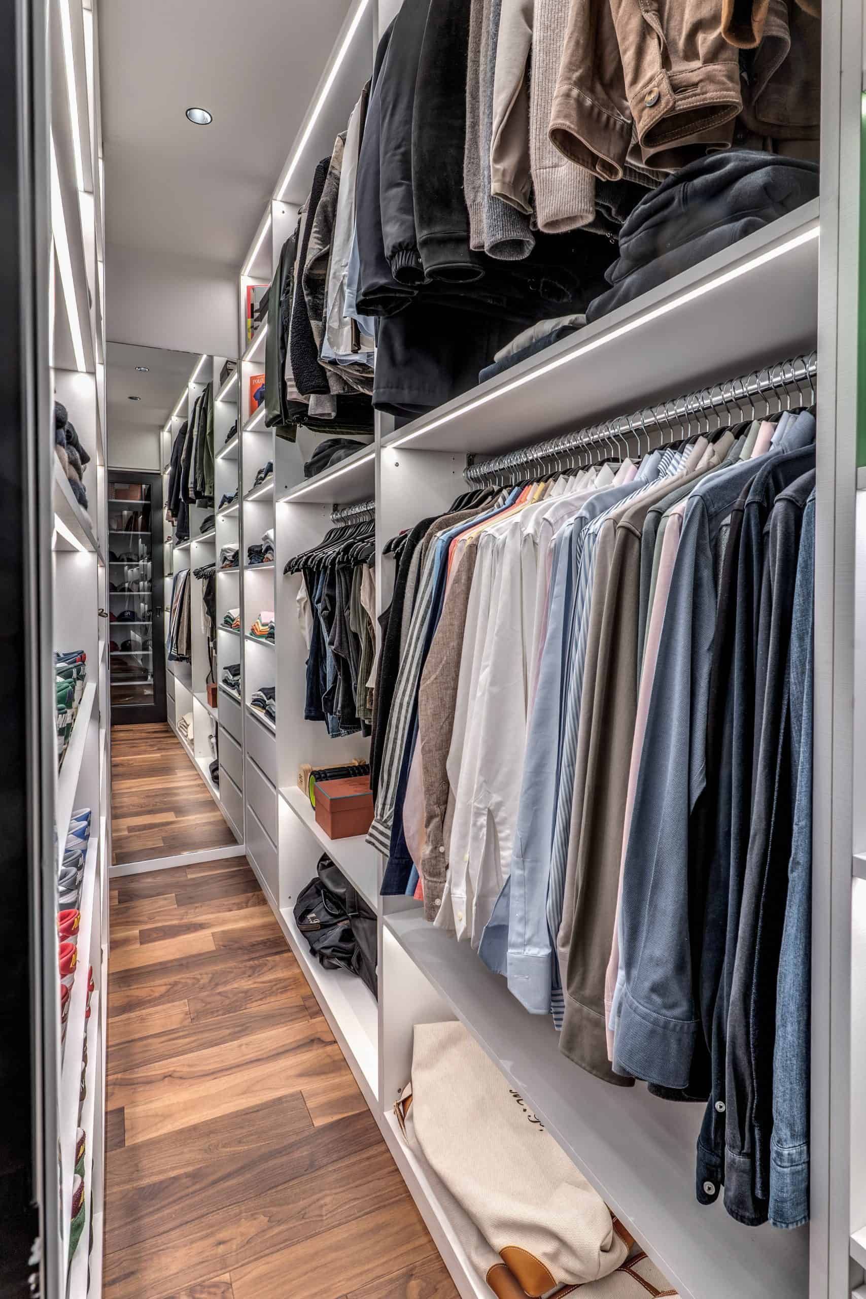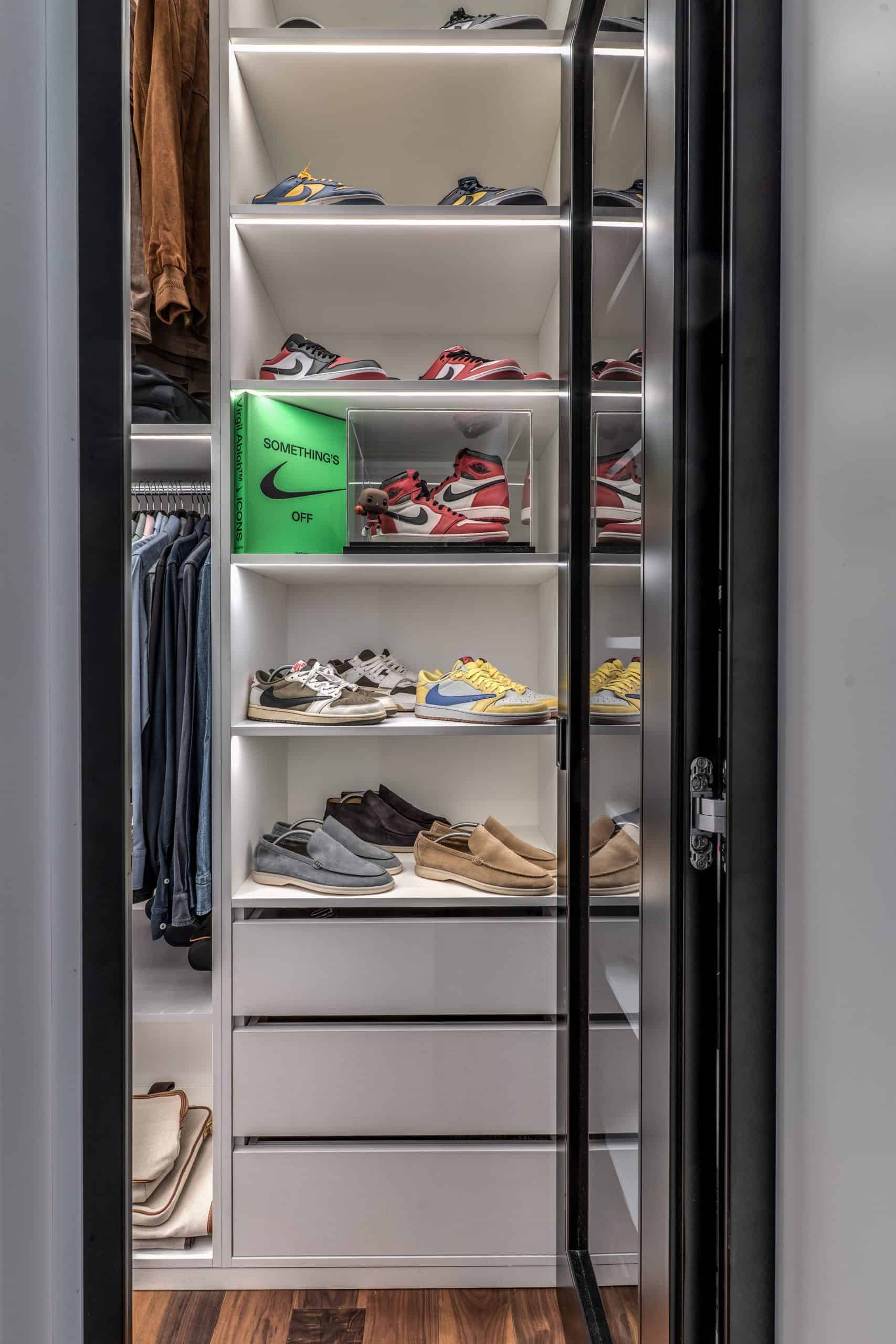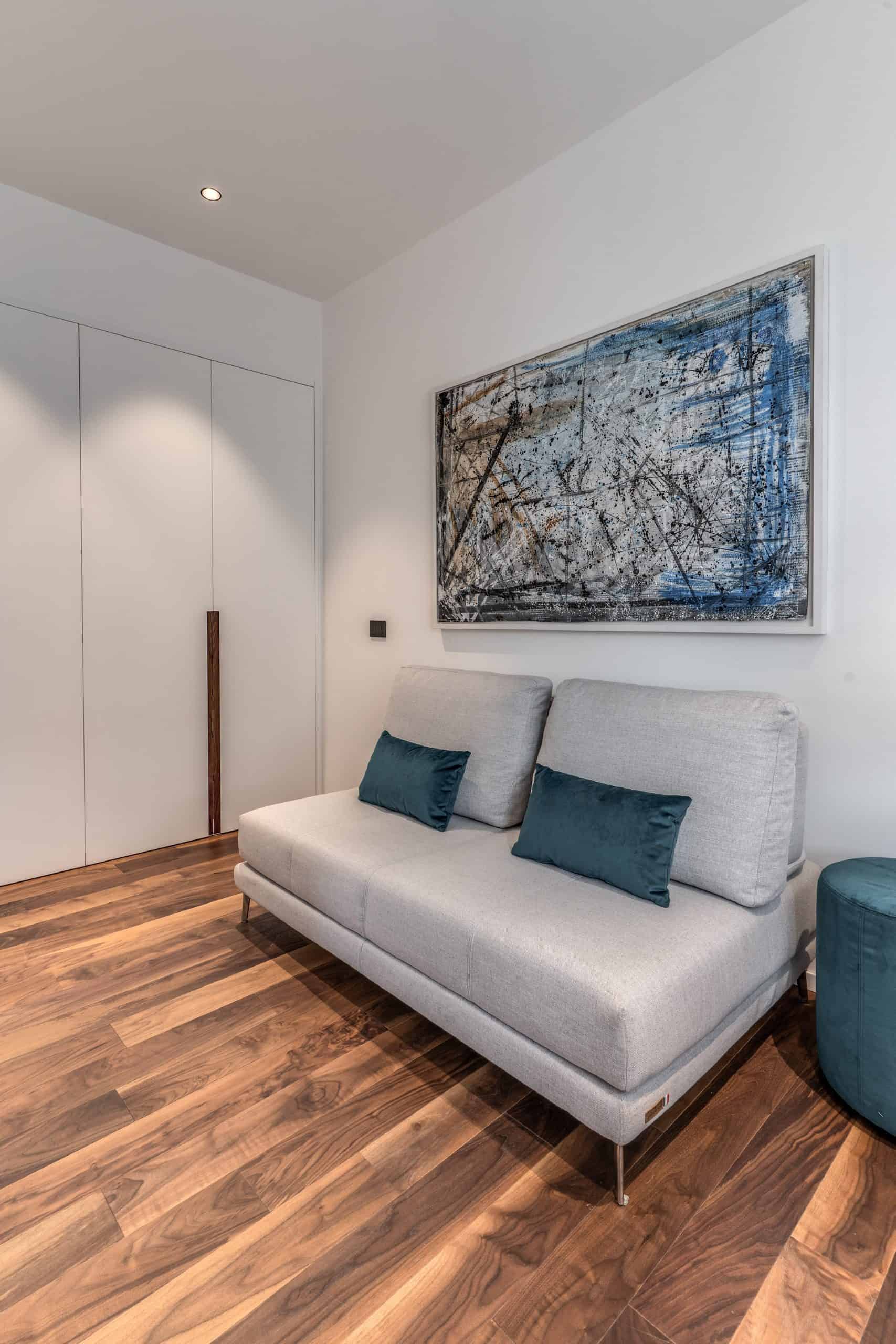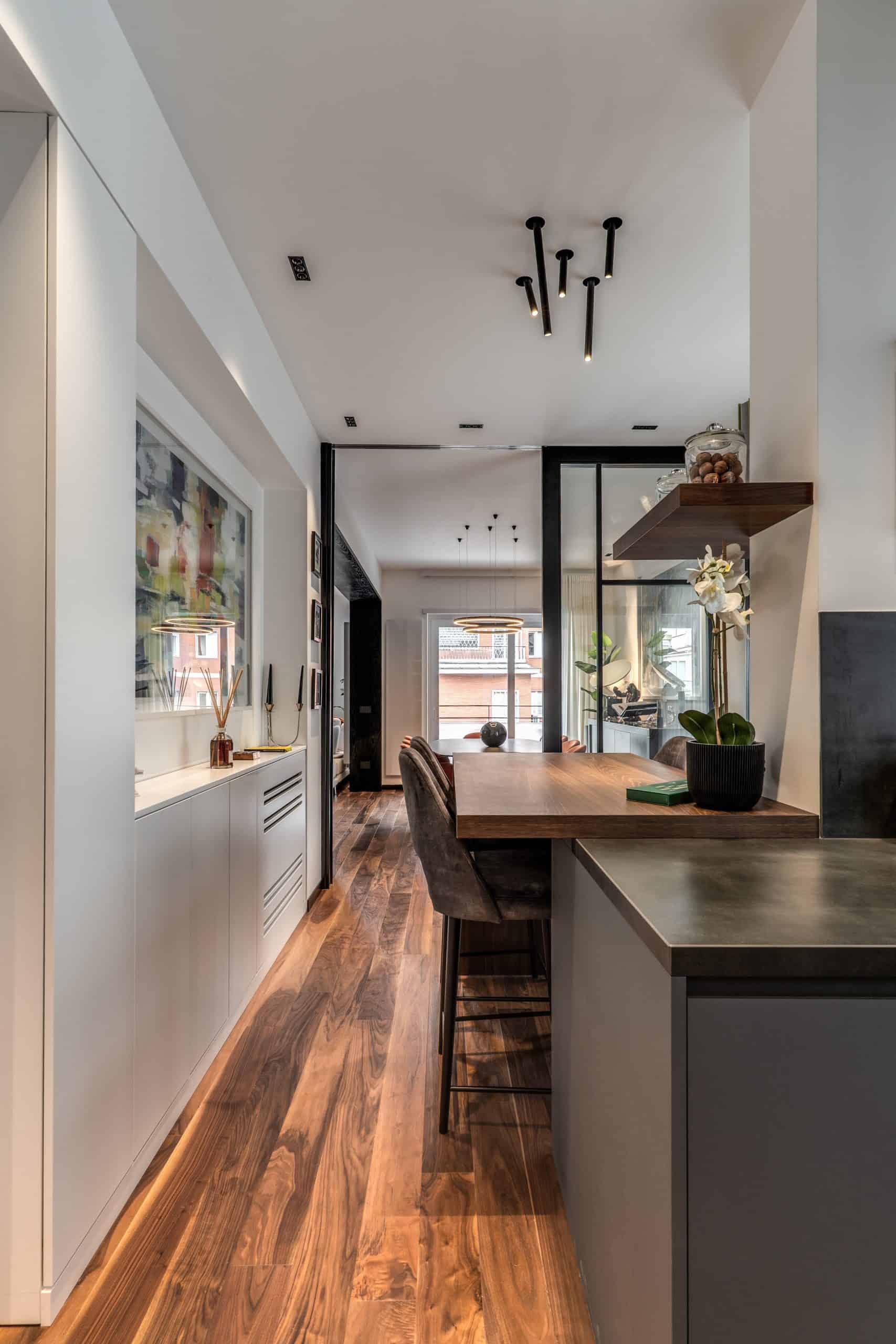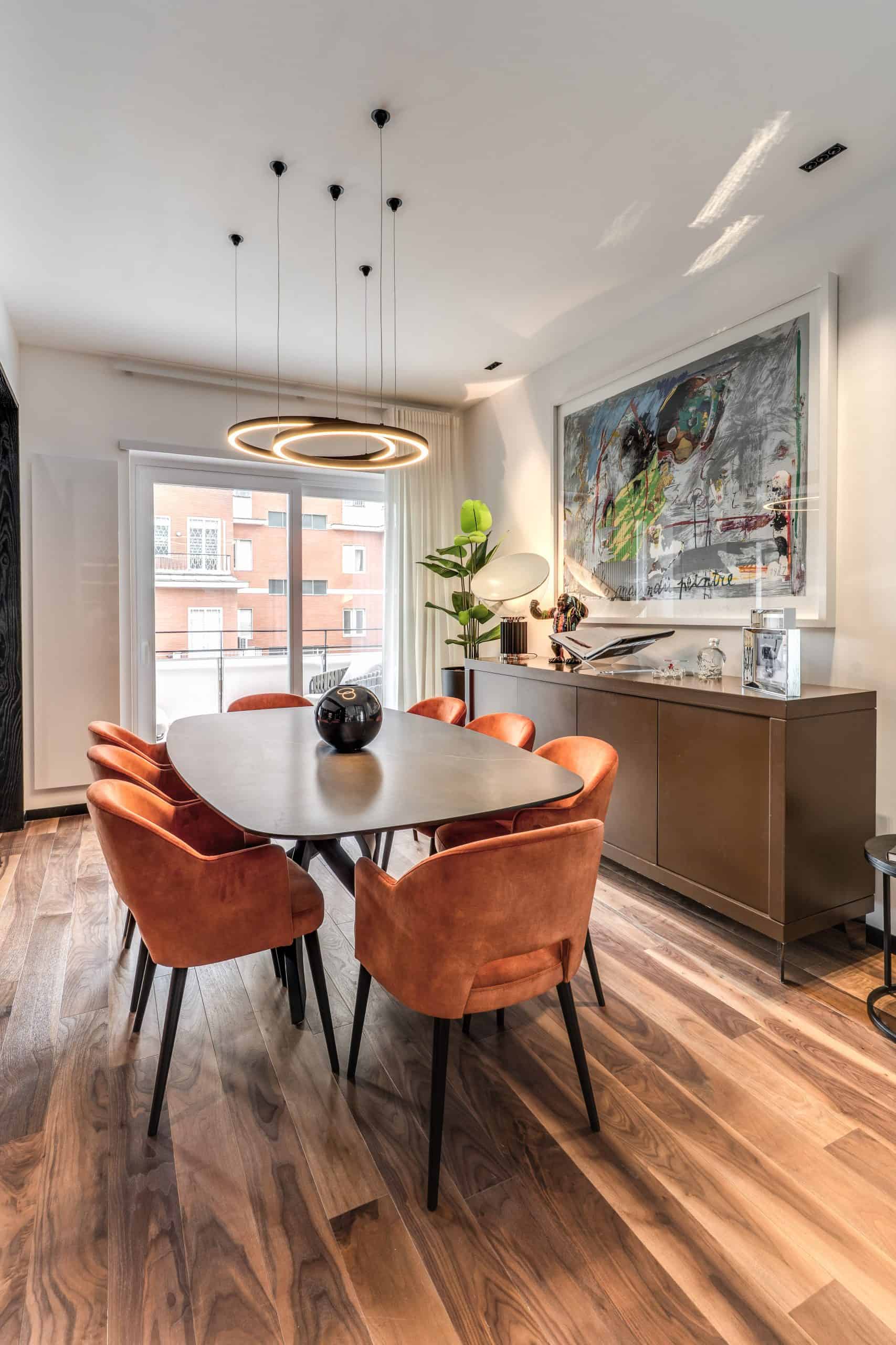 Sin dalla soglia, l’ingresso annuncia un linguaggio architettonico che fonde pulizia compositiva e intensità materica. Le superfici in noce americano disegnano un pavimento continuo, vivo, cangiante, che attraversa tutto l’appartamento come un tappeto prezioso. Le pareti irivestite in legno noce americano cannettato accolgono una lama di luce verticale che guida lo sguardo e accompagna il passo. È una scena silenziosa e teatrale, dove il dettaglio racconta già un’intera poetica. Il soggiorno si apre come un grande salone borghese, reinterpretato con sensibilità contemporanea. Il sistema libreria a tutta parete in legno scuro, con moduli aperti e retroilluminati, ospita oggetti d’arte, libri, modellini e ricordi, trasformando la parete attrezzata in un museo personale.Il divano centrale, ampio e scultoreo, si veste di tessuti neutri e accoglie accenti cromatici aranciati nei cuscini, in dialogo con le sedie della zona pranzo. La luce naturale, filtrata da tende a onda, invade la scena con delicatezza, ammorbidendo i contrasti materici e disegnando una spazialità profonda e ariosa.Racchiusa tra pannelli in vetro e legno, la cucina è un blocco elegante e rigoroso. I pensili in essenza e i frontali in grigio fumo si articolano intorno all’isola centrale in legno scuro, che funge da bar, tavolo conviviale e centro operativo. I volumi sono netti, privi di maniglie, disegnati come architetture autonome.Il gioco dei pieni e vuoti, insieme alla presenza della vetrina retroilluminata con oggetti in esposizione, restituisce una cucina non solo funzionale, ma anche espressiva, vissuta come spazio di rappresentazione e ritualità.Separata da una cornice architettonica in legno bruno, la zona pranzo accoglie un tavolo scuro in pietra naturale, coronato da due lampade ad anello sospese, che sembrano fluttuare nell’aria. Le sedute in velluto arancio bruciato portano calore e intimità, mentre sullo sfondo un’opera d’arte astratta incornicia lo spazio con un gesto pittorico e materico.La camera principale è un rifugio elegante e misurato. Il blu intenso della parete di testata, modulato da righe verticali e cornici sottili, fa da fondale al letto imbottito in tessuto chiaro. Le lampade a sospensione dai toni ottone satinato e i comodini in noce sospesi rafforzano la leggerezza compositiva.Il vero colpo di scena è celato dietro la parete TV: una cabina armadio luminosa e perfettamente organizzata si apre come una boutique privata. Ripiani retroilluminati e nicchie espositive trasformano il contenimento in una celebrazione del gusto personale. Il bagno en suite si presenta con superfici in grès effetto marmo e volumi puri. Il lavabo integrato nel top in pietra dialoga con la rubinetteria nera opaca, mentre la doccia walk-in è definita da una parete scura a vena continua che funge da quinta scenica. Un taglio di luce perimetrale esalta la verticalità dello spazio, trasformando la doccia in un rito architettonico. Il bagno degli ospiti, più raccolto, si distingue per equilibrio e coerenza materica. Le pareti in grès strutturato effetto tessuto accolgono un mobile lavabo con frontale listellato e lavabo integrato. Le luci radenti e il grande specchio retroilluminato restituiscono profondità e garbo, senza mai rinunciare alla funzionalità. La seconda camera ospita un doppio ruolo: zona relax con divano letto e area studio. Una scrivania sospesa in noce, affiancata da mensole, opere grafiche e fotografie d’epoca, racconta un luogo di concentrazione intima. I tessuti chiari e vellutati, i cuscini petrolio e la presenza di piante e oggetti evocano una dimensione privata, ma aperta, perfetta per accogliere o lavorare.